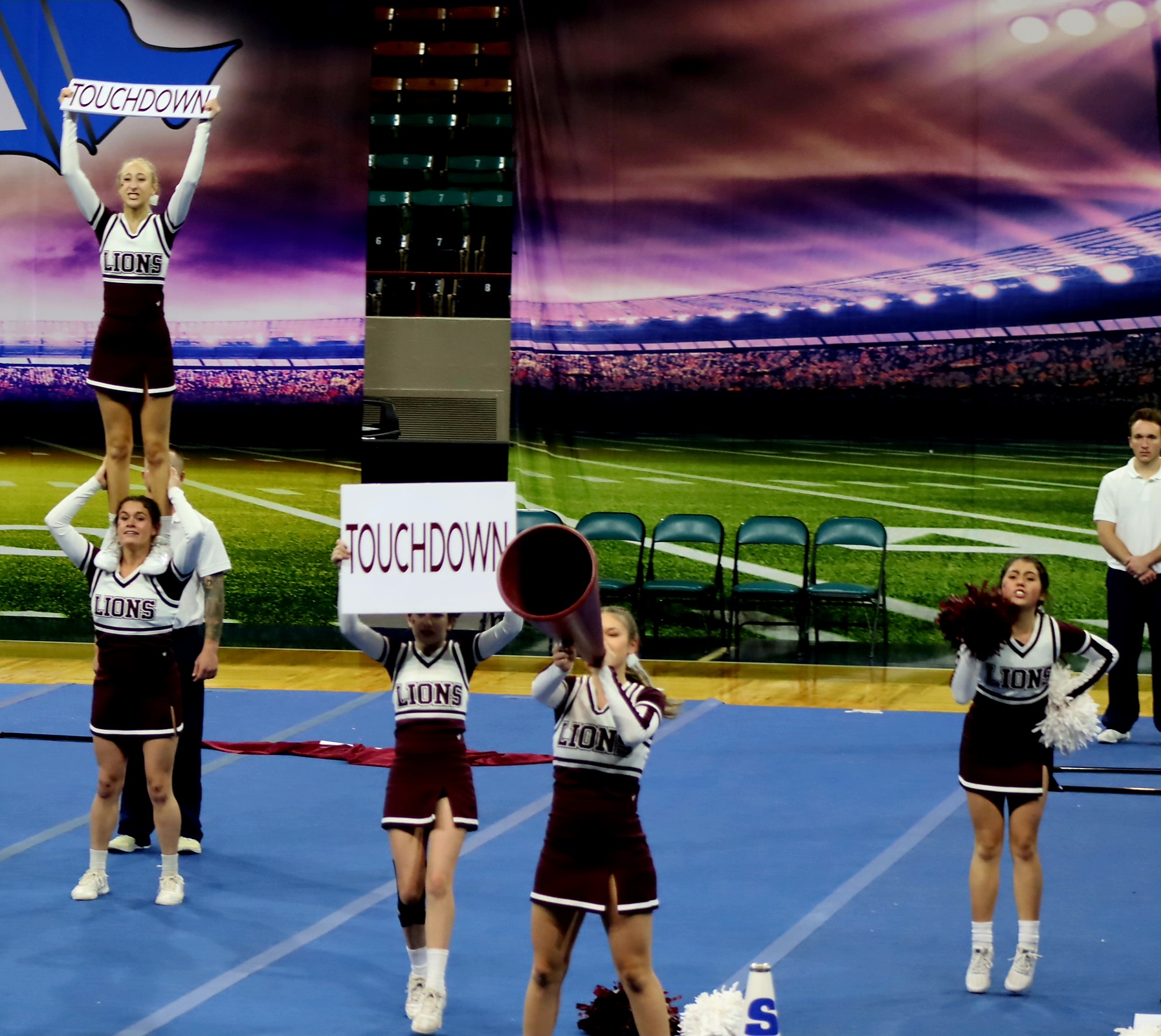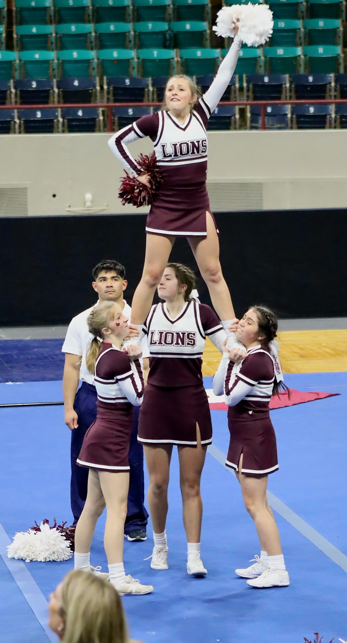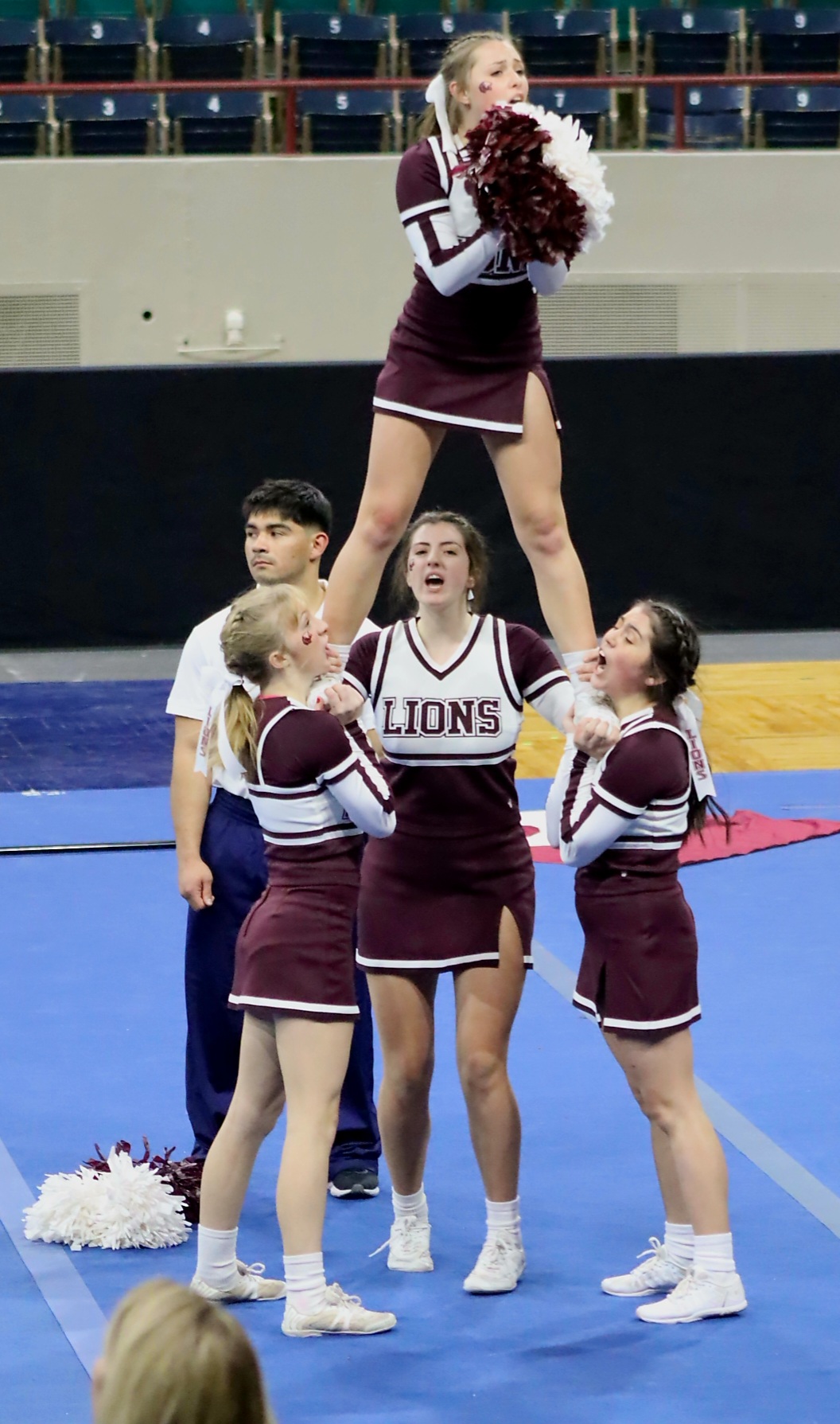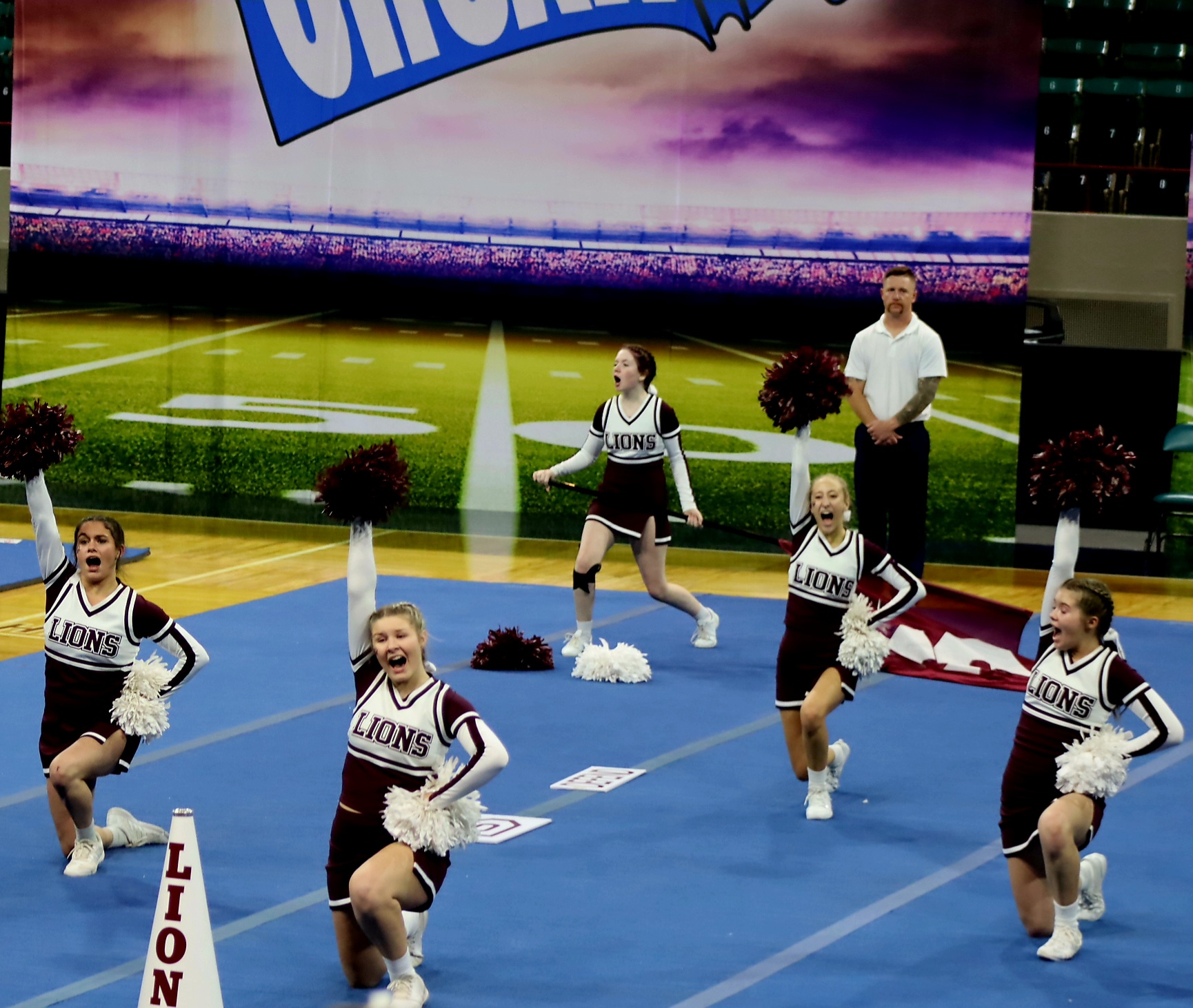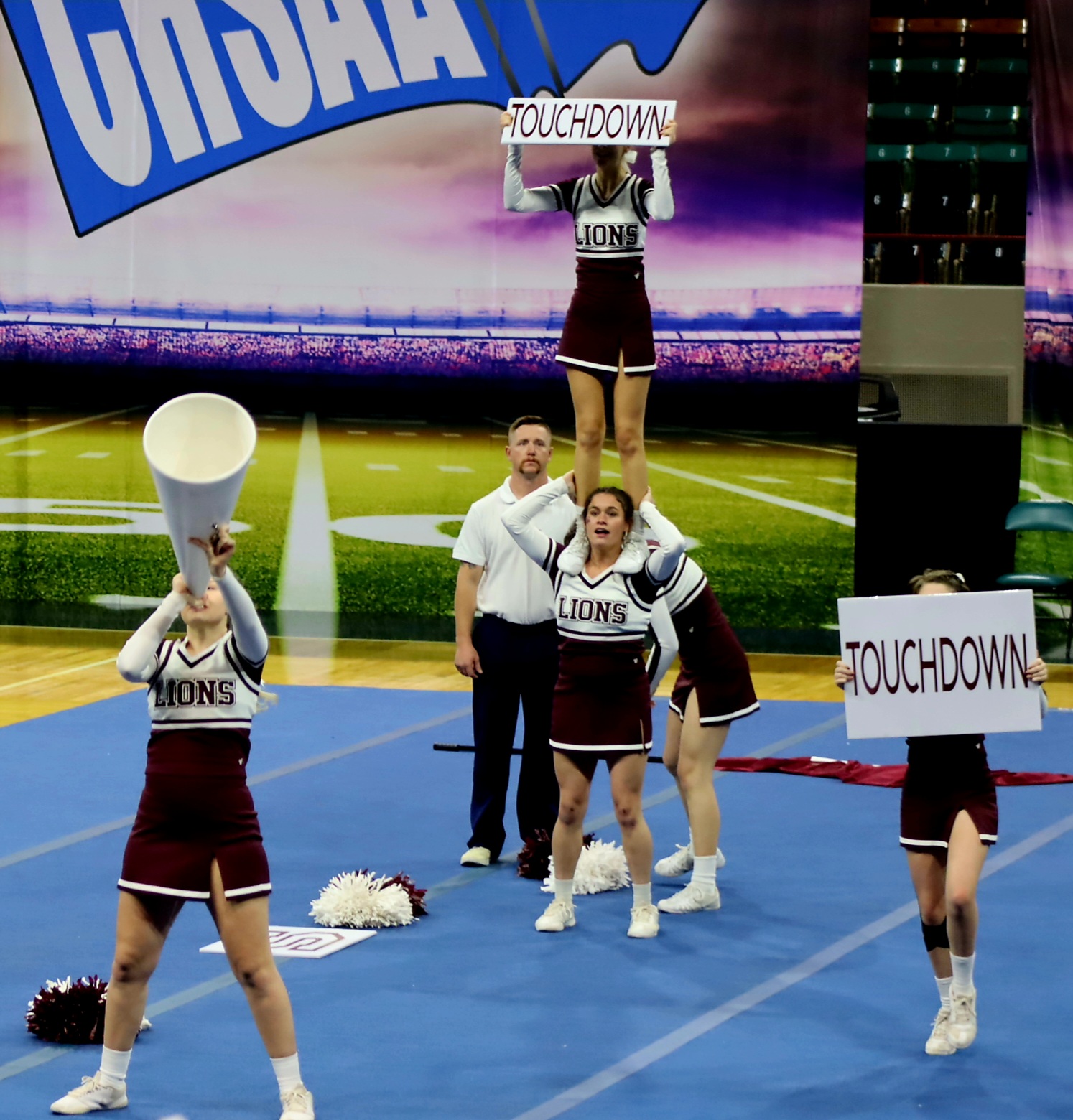 Description: The Swink Lions Cheerleaders Placed 4th in the Game Day Division at The CHSAA 2A-3A State Spirit Championships at the Denver Coliseum on December 8, 2022.