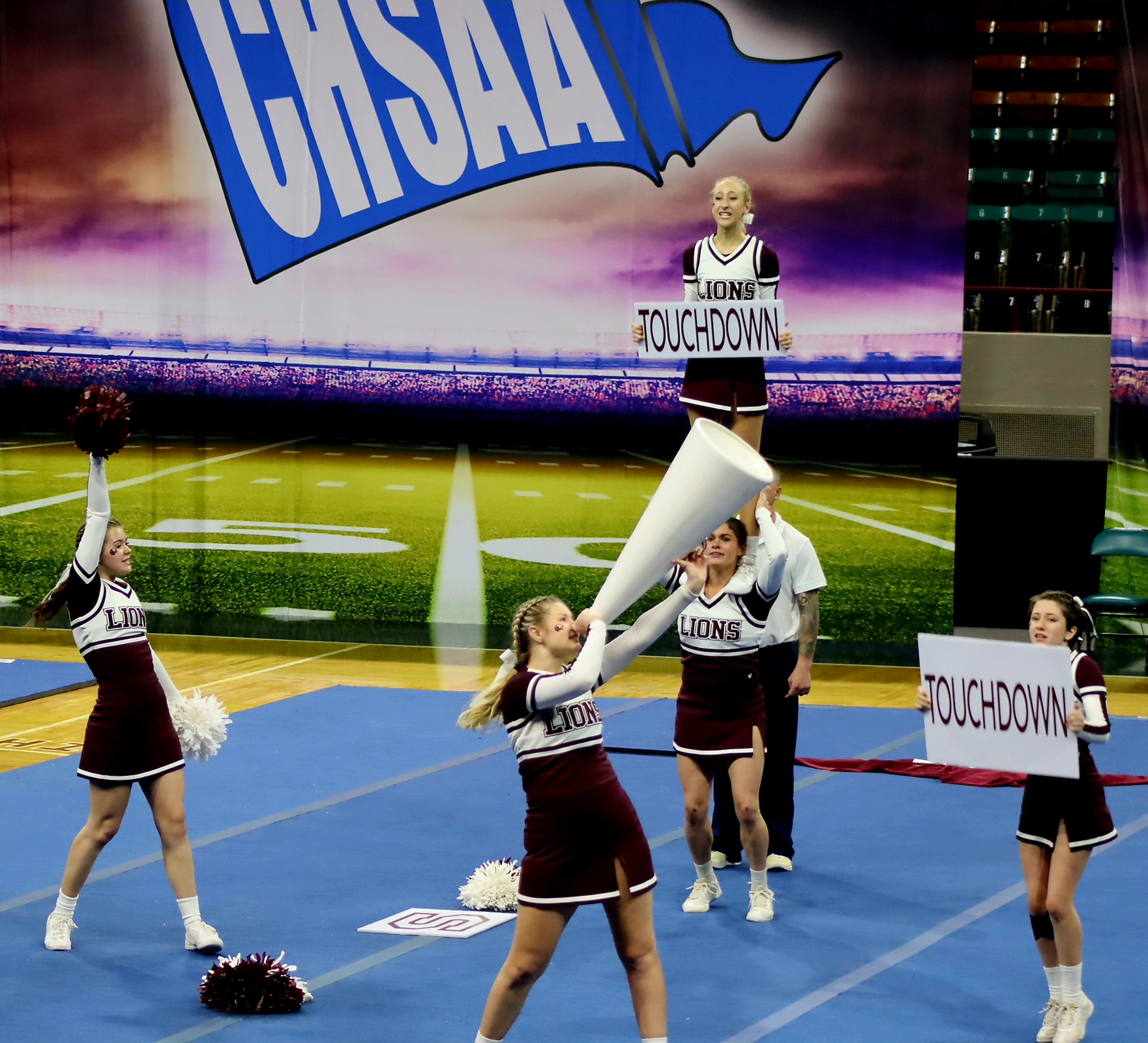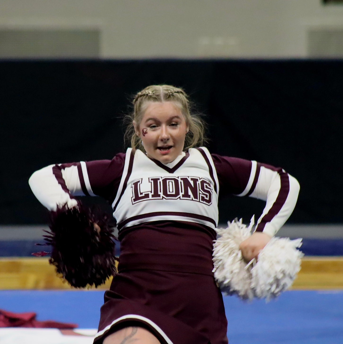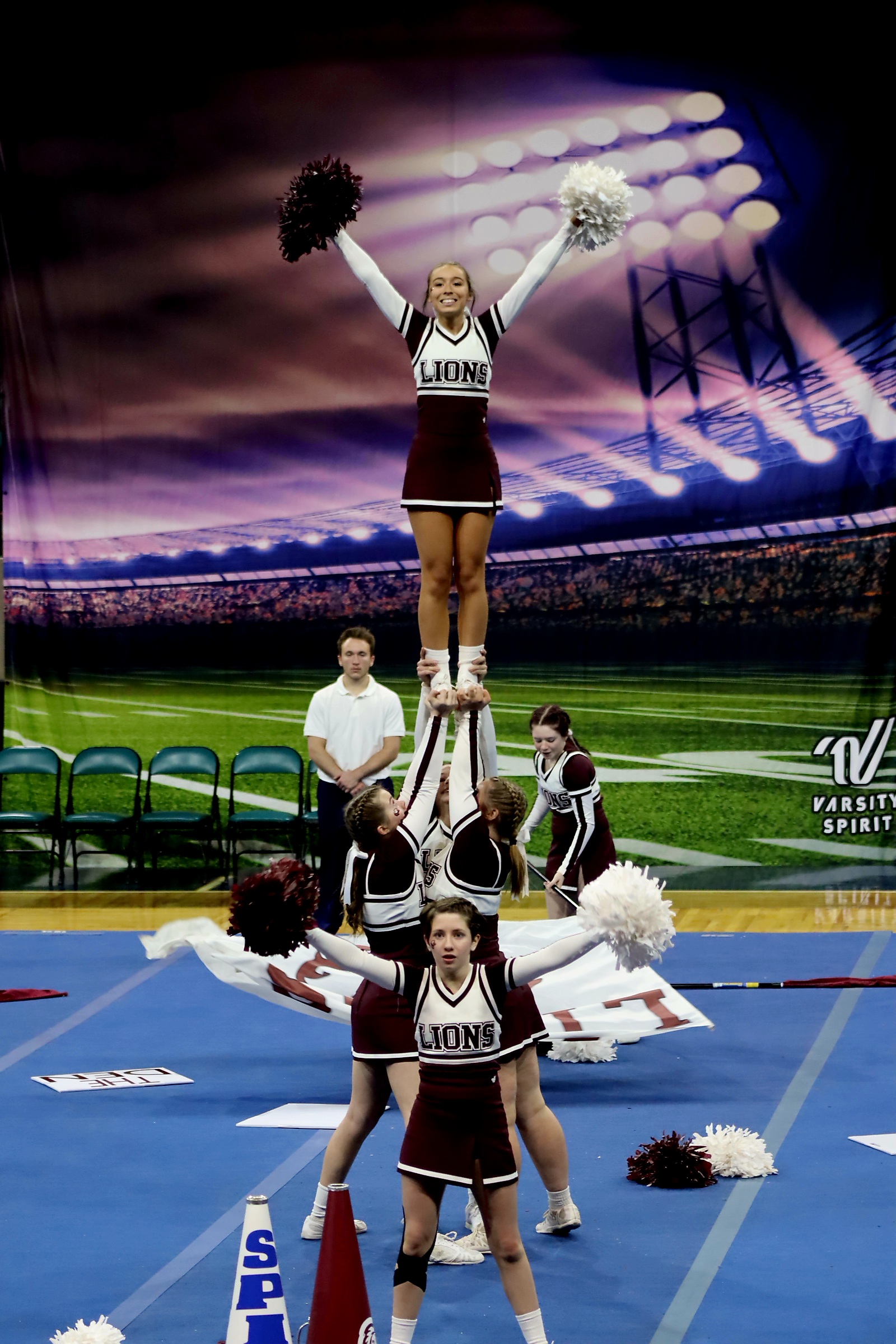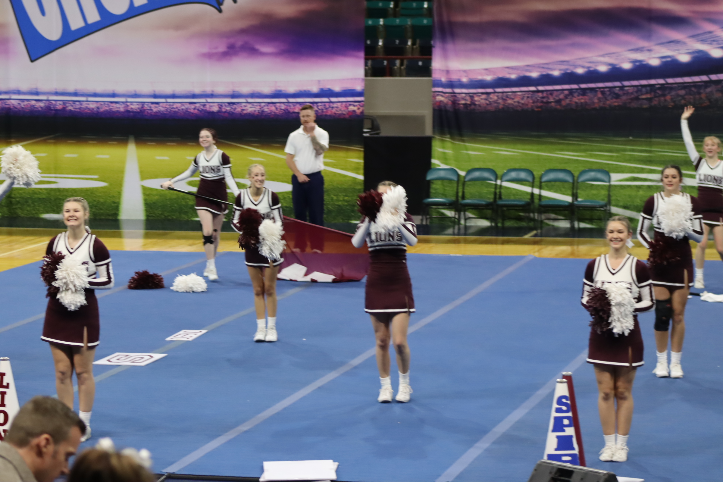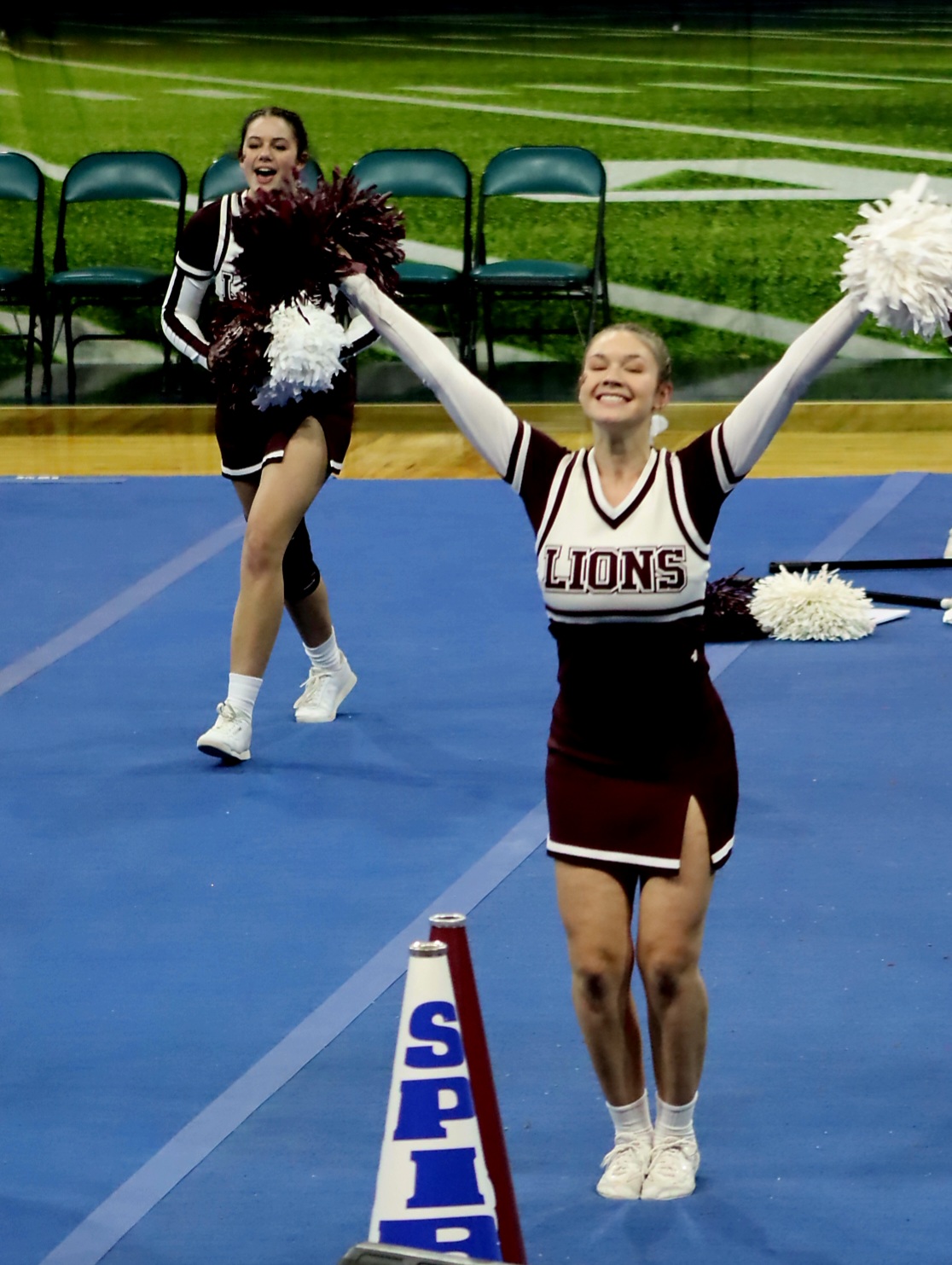Description: The Swink Lions Cheerleaders Placed 4th in the Game Day Division at The CHSAA 2A-3A State Spirit Championships at the Denver Coliseum on December 8, 2022.