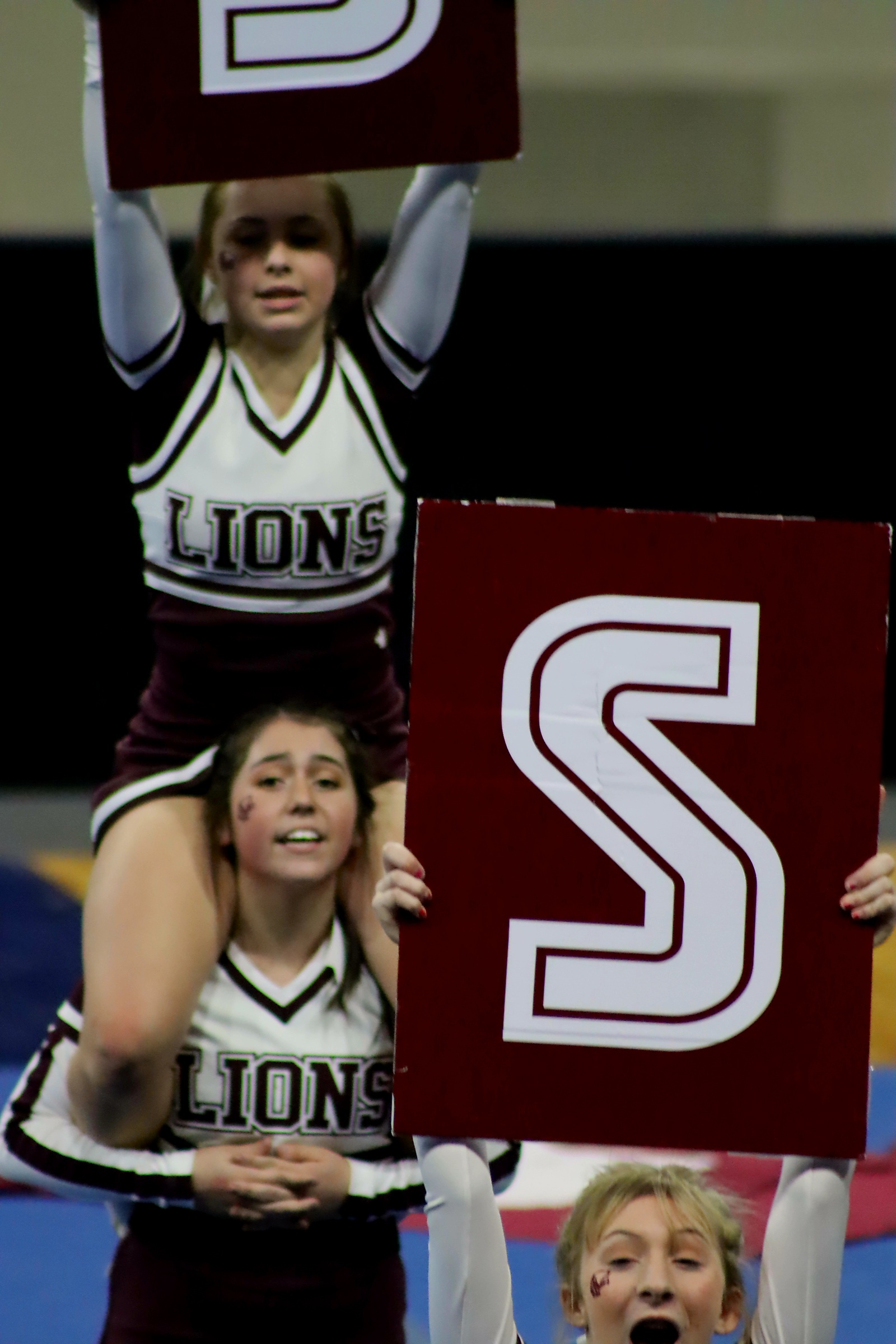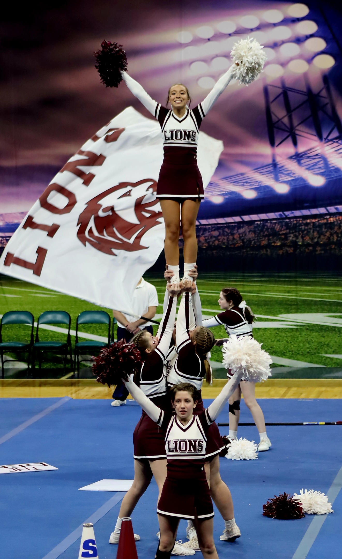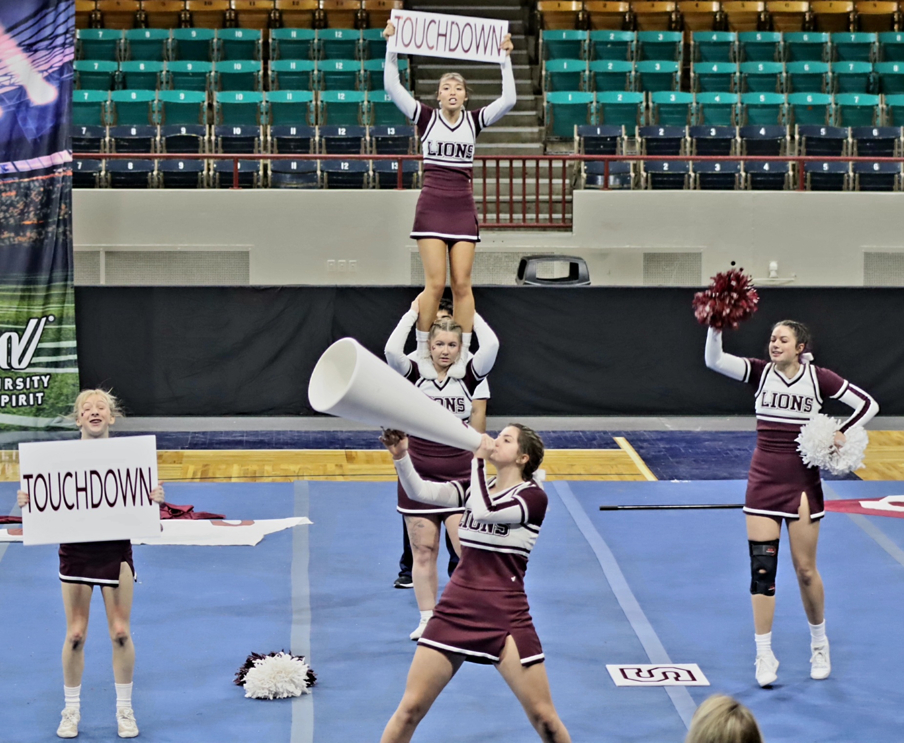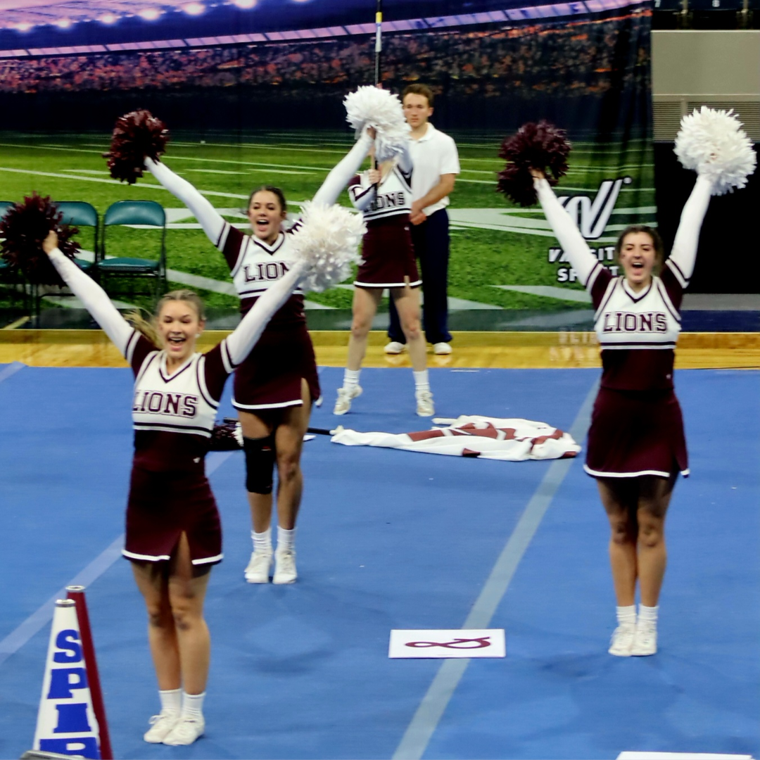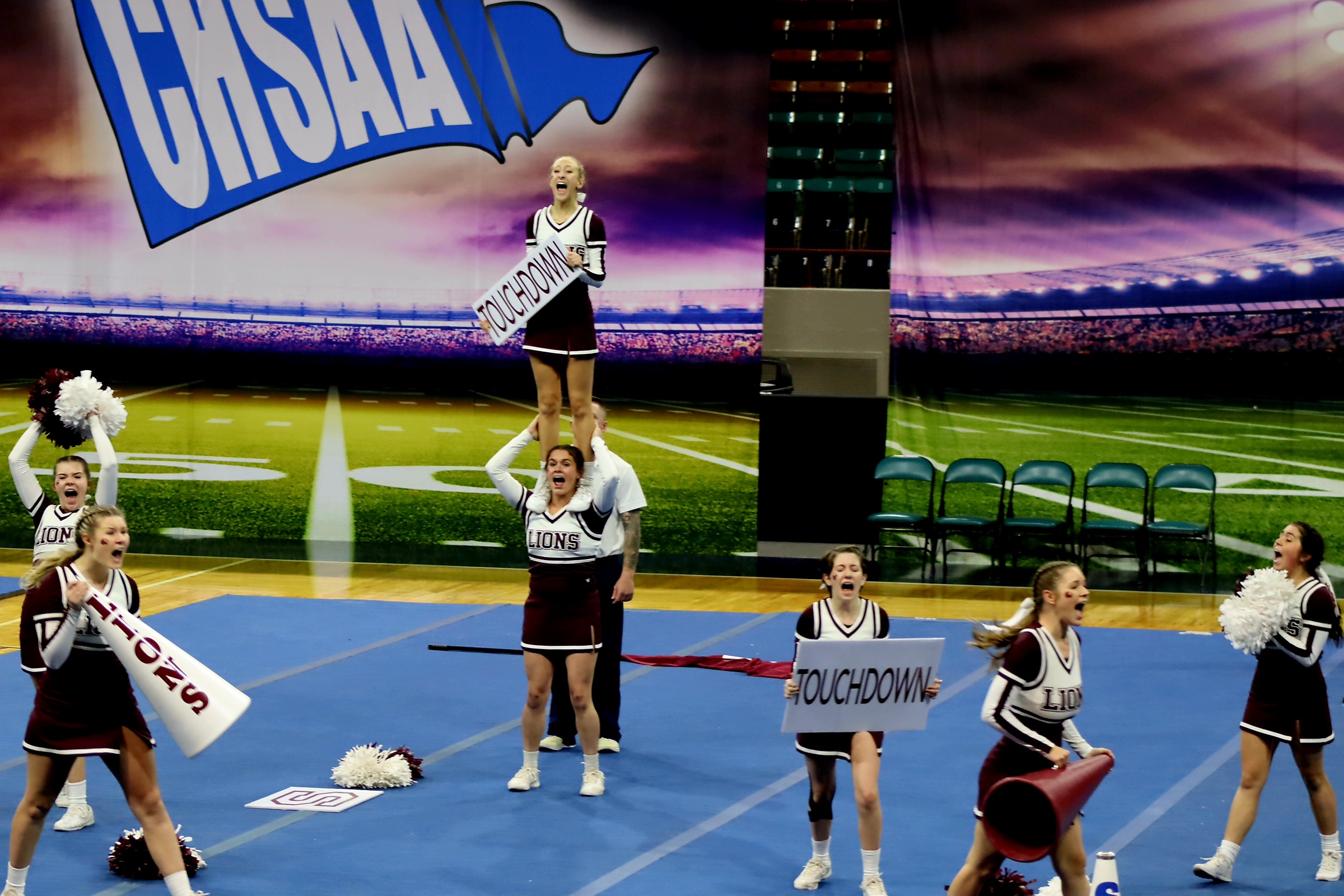 Description: The Swink Lions Cheerleaders Placed 4th in the Game Day Division at The CHSAA 2A-3A State Spirit Championships at the Denver Coliseum on December 8, 2022.