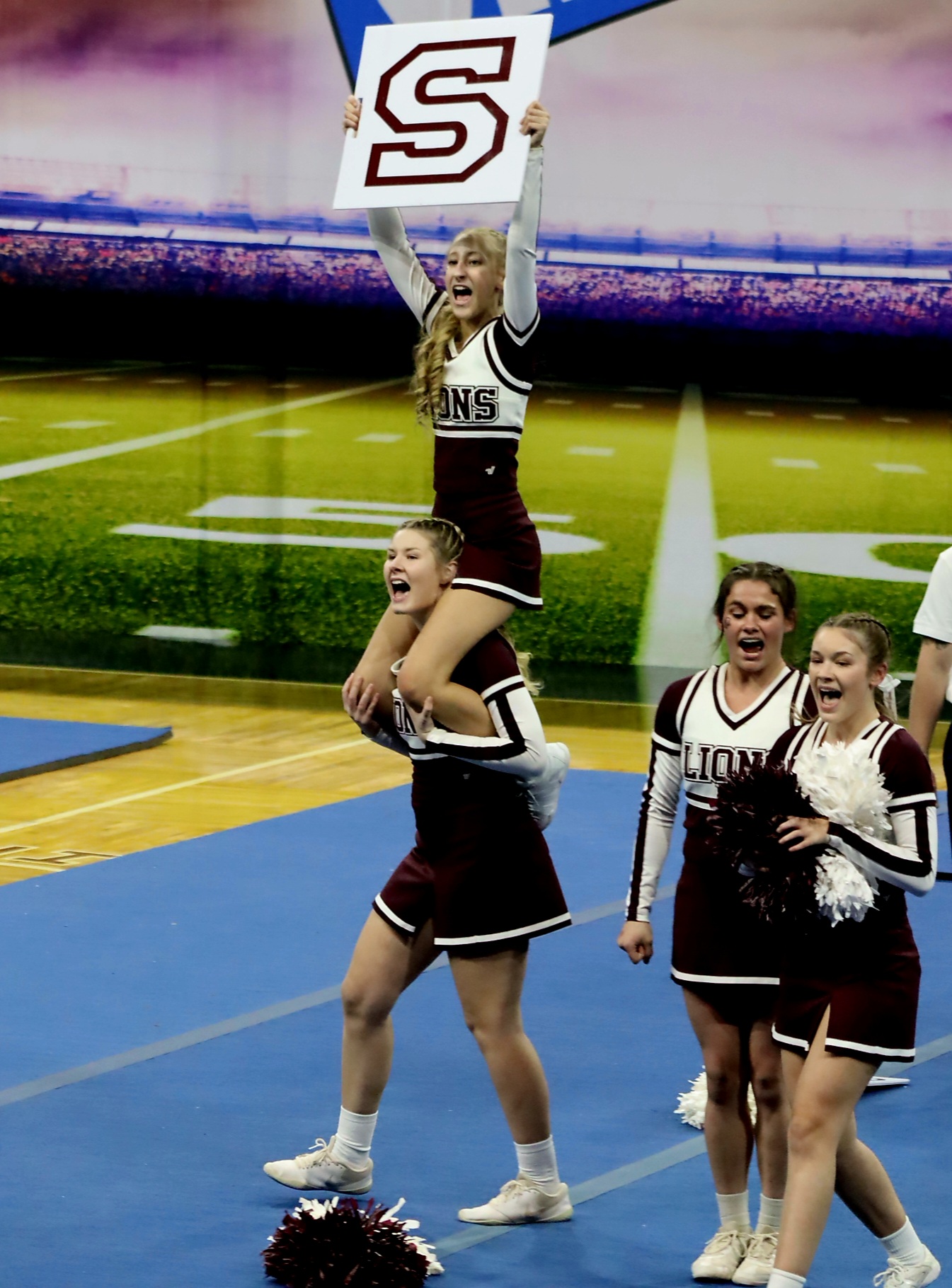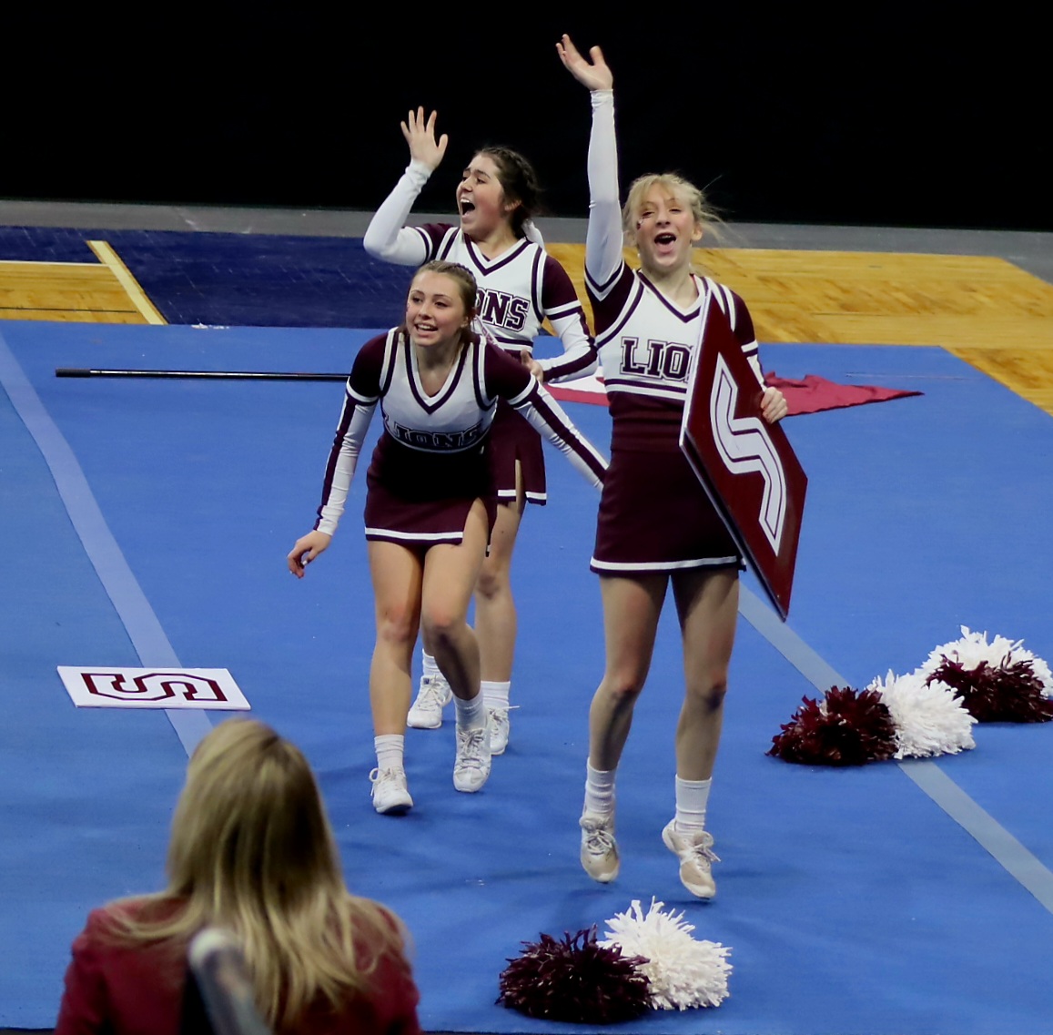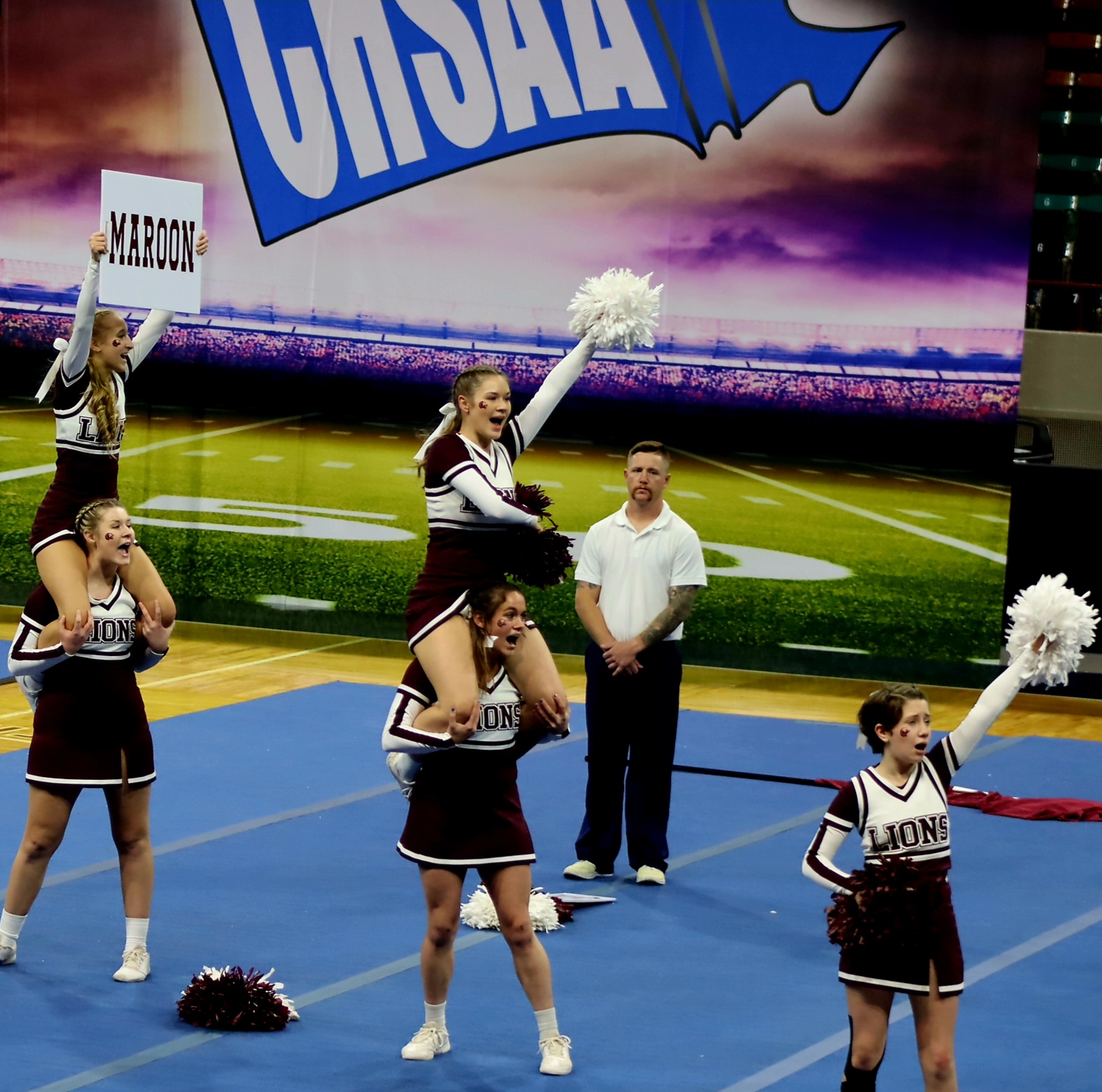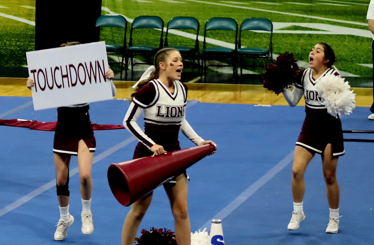 Description: The Swink Lions Cheerleaders Placed 4th in the Game Day Division at The CHSAA 2A-3A State Spirit Championships at the Denver Coliseum on December 8, 2022.