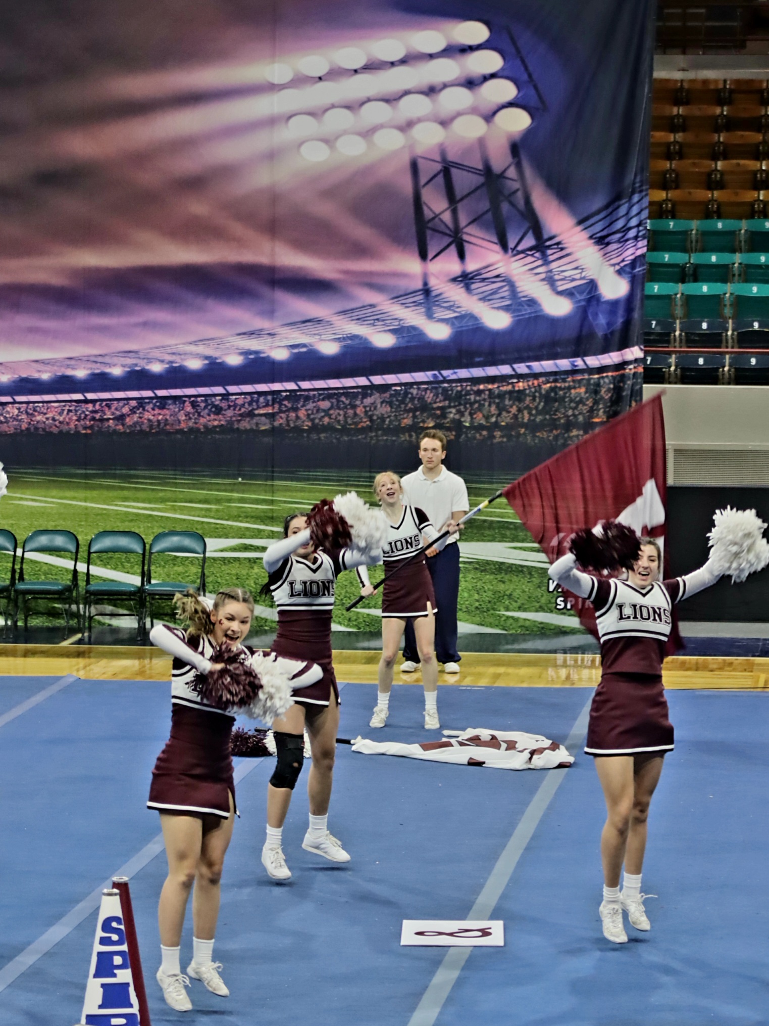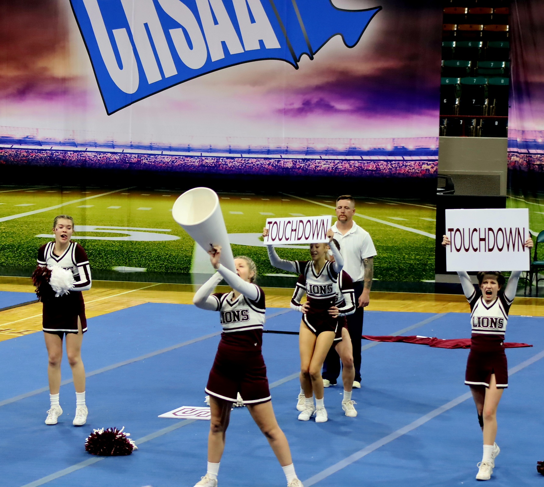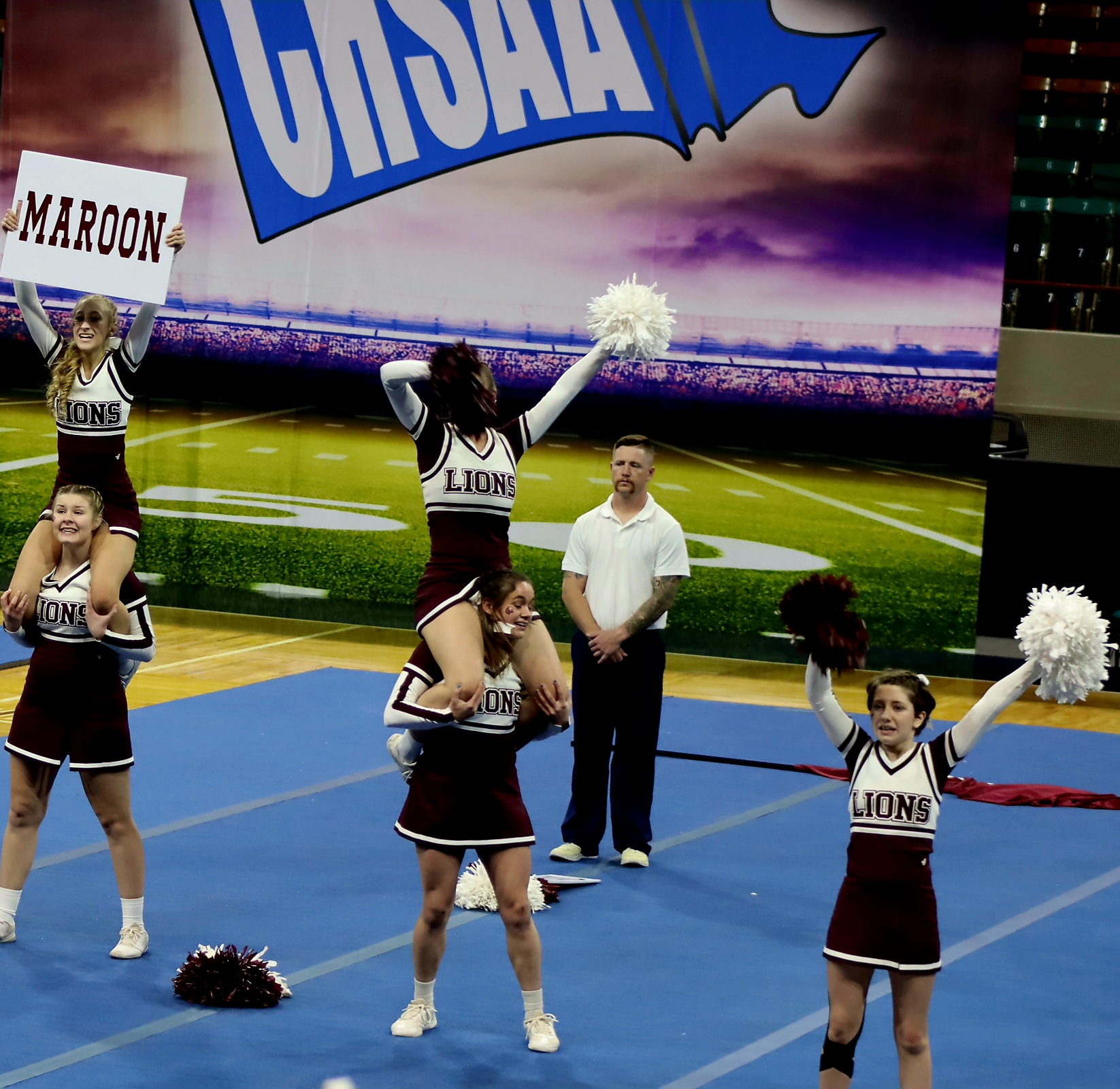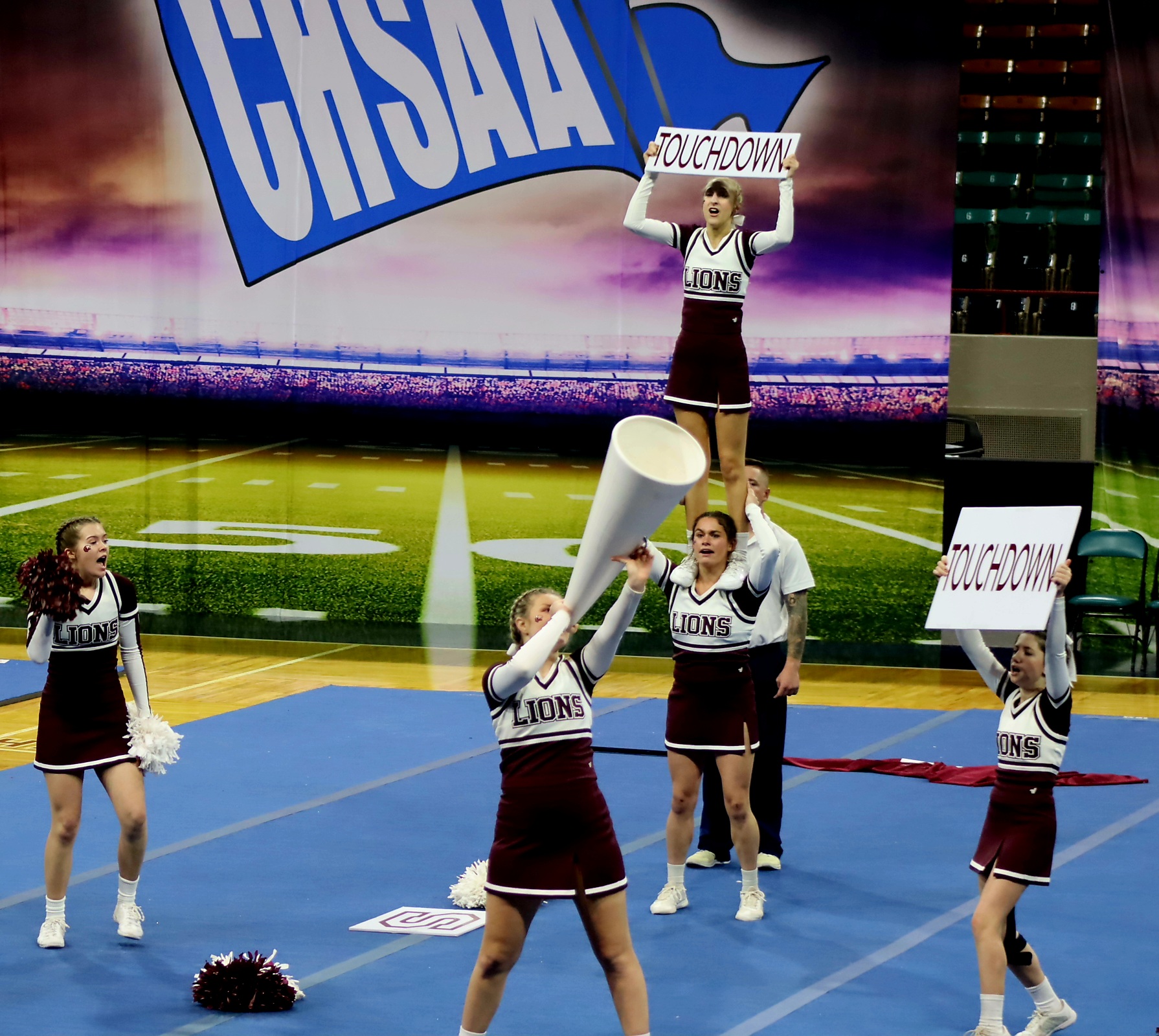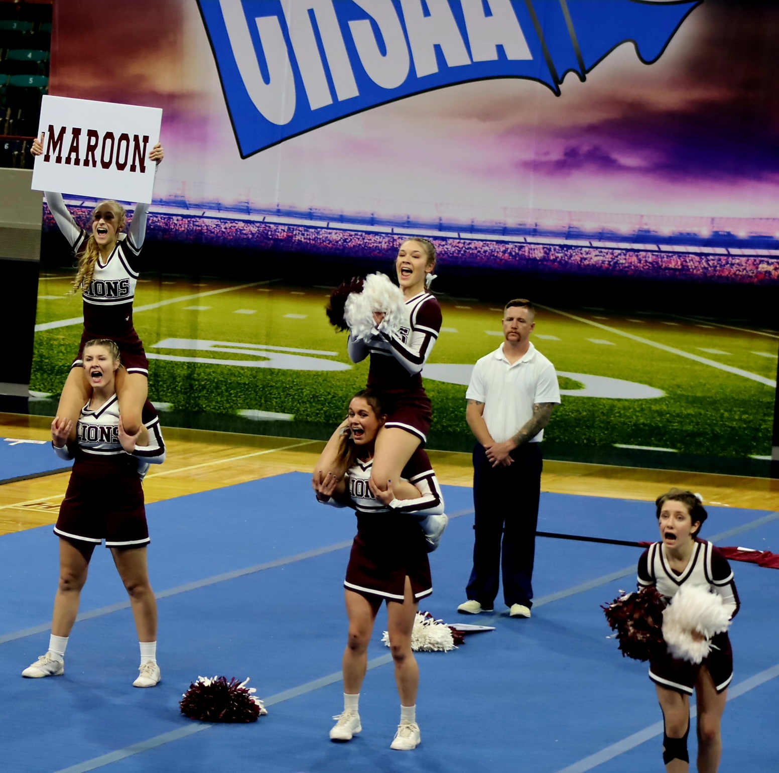 Description: The Swink Lions Cheerleaders Placed 4th in the Game Day Division at The CHSAA 2A-3A State Spirit Championships at the Denver Coliseum on December 8, 2022.