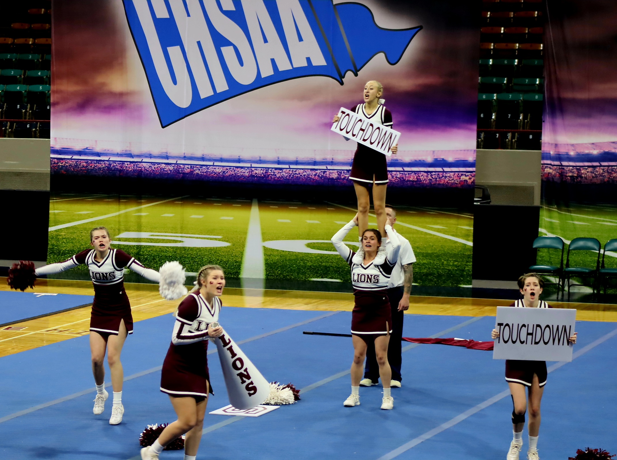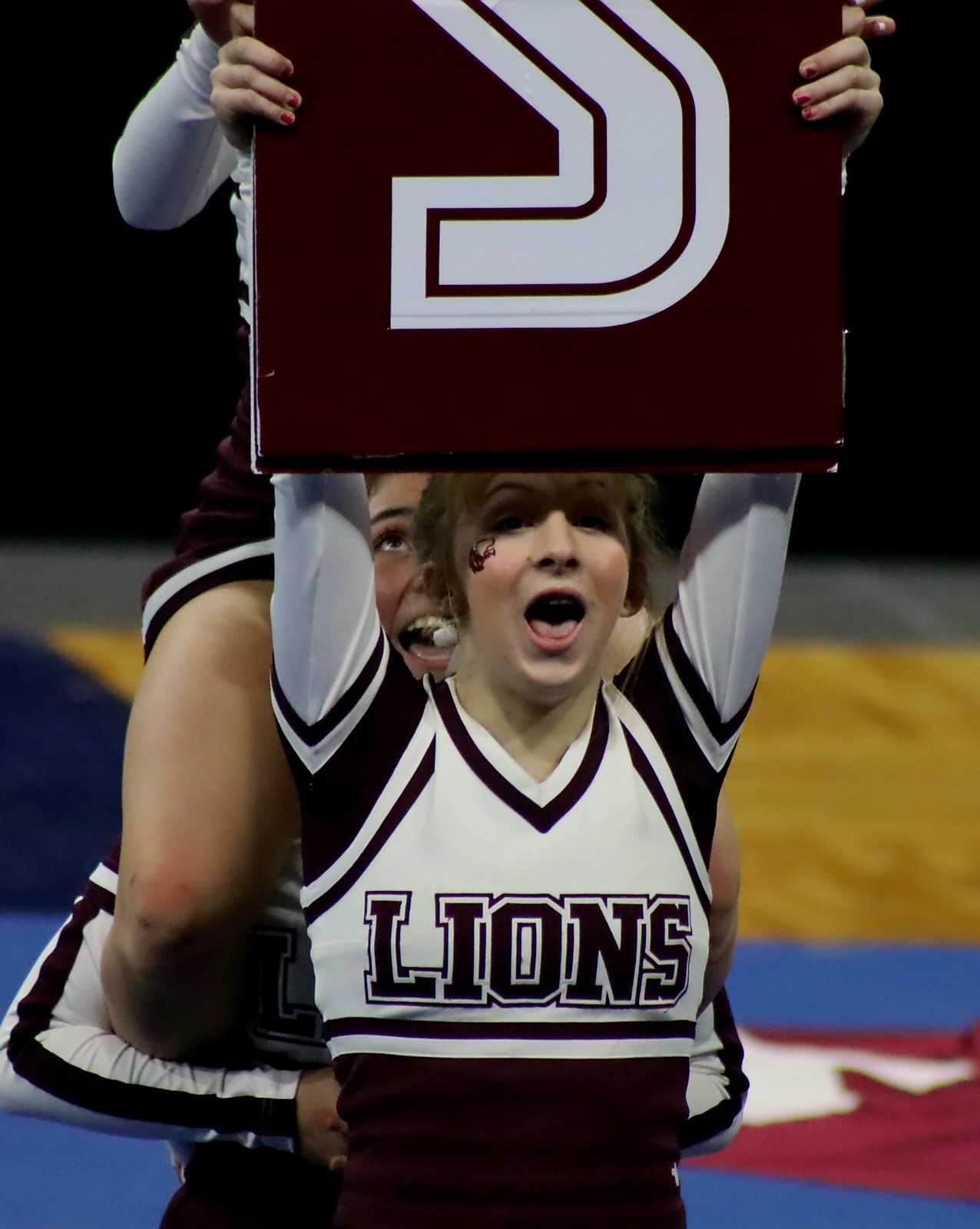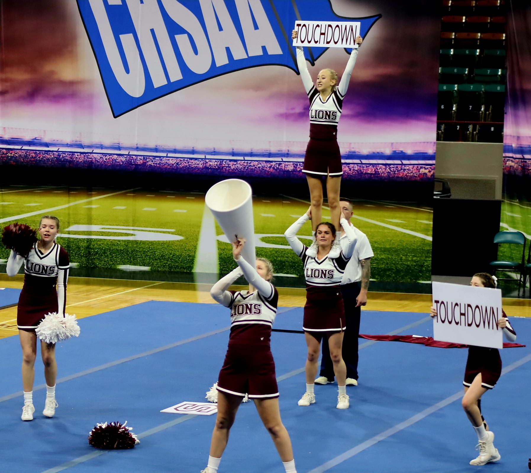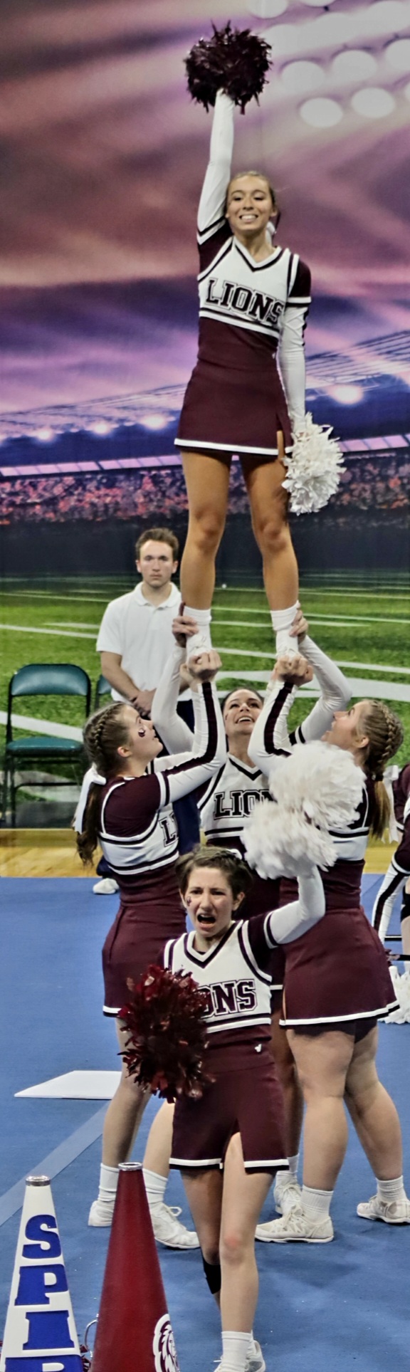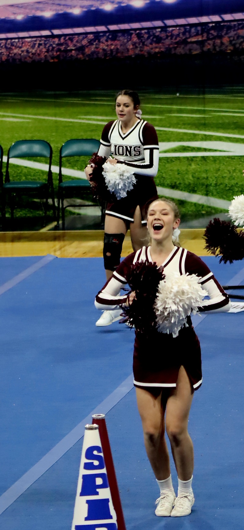 Description: The Swink Lions Cheerleaders Placed 4th in the Game Day Division at The CHSAA 2A-3A State Spirit Championships at the Denver Coliseum on December 8, 2022.