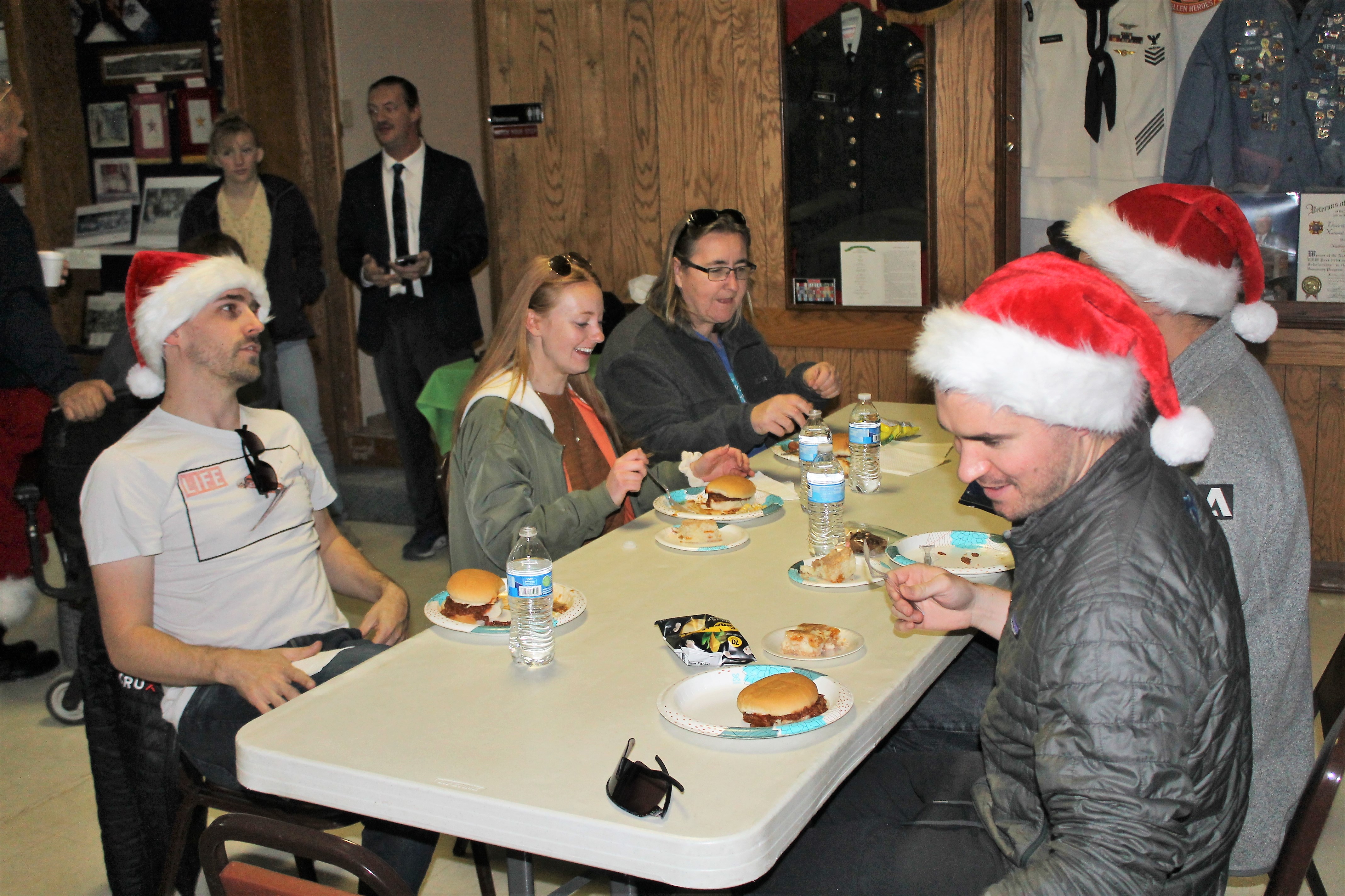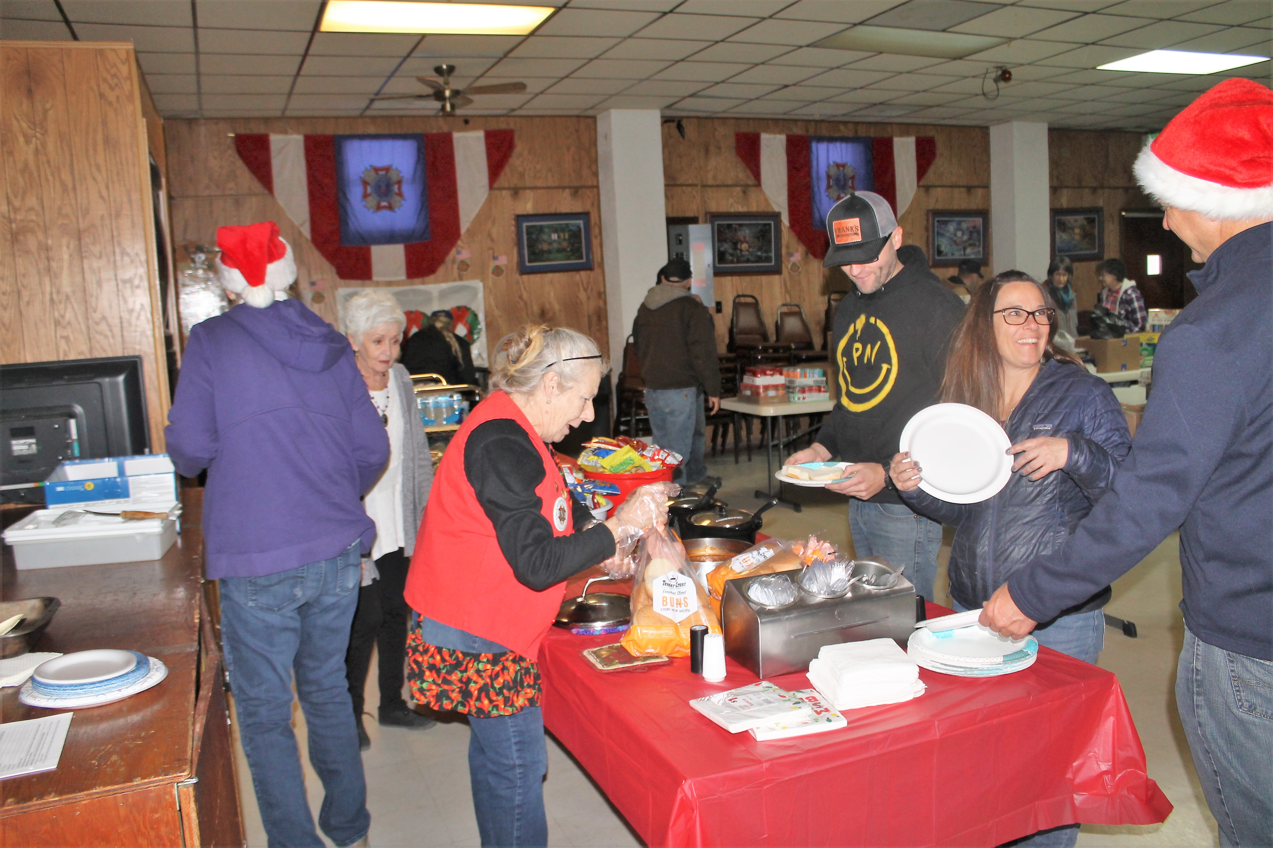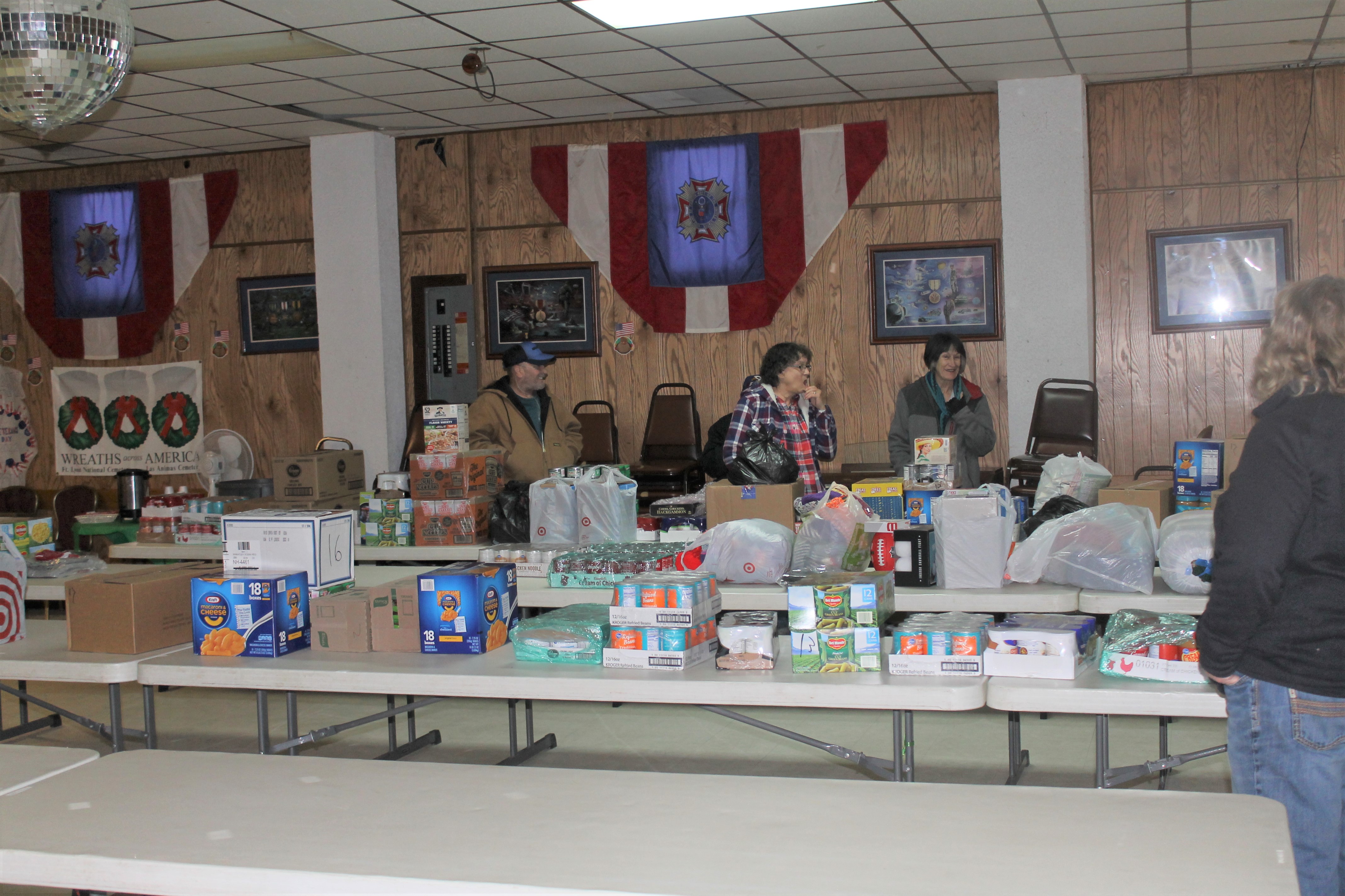 The food and toys were unloaded by five Post VFW members, nine Auxiliary members, and 11 community workers including Santa Claus. A meal was prepared by Auxiliary members and 34 people were served a delicious sloppy joe sandwich, with chips, salad, and dessert. The following day we had five Auxiliary members, and 4 non-members help us break down, distribute, and deliver the boxes of food and toys.