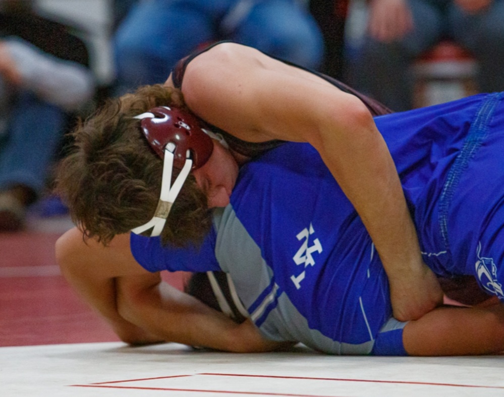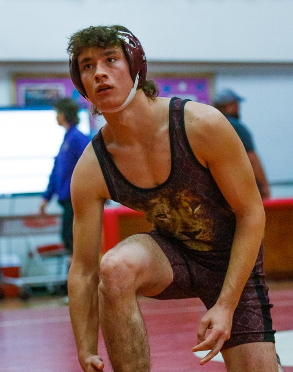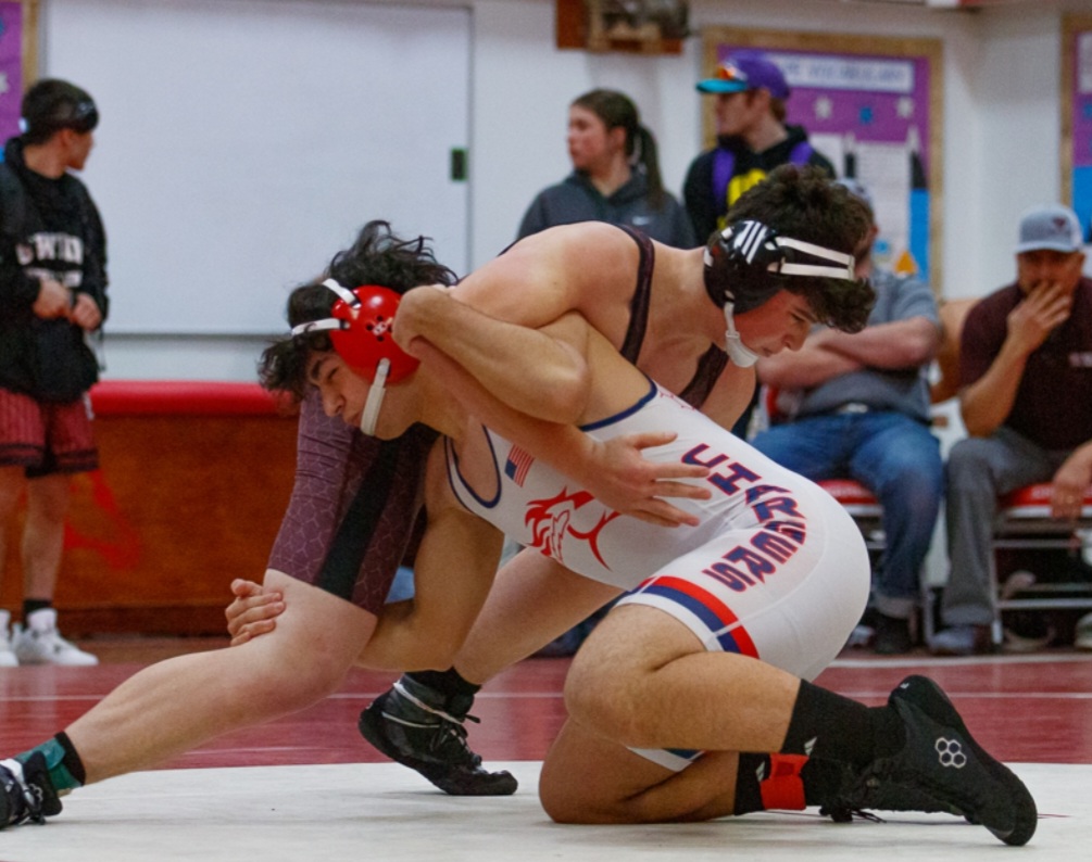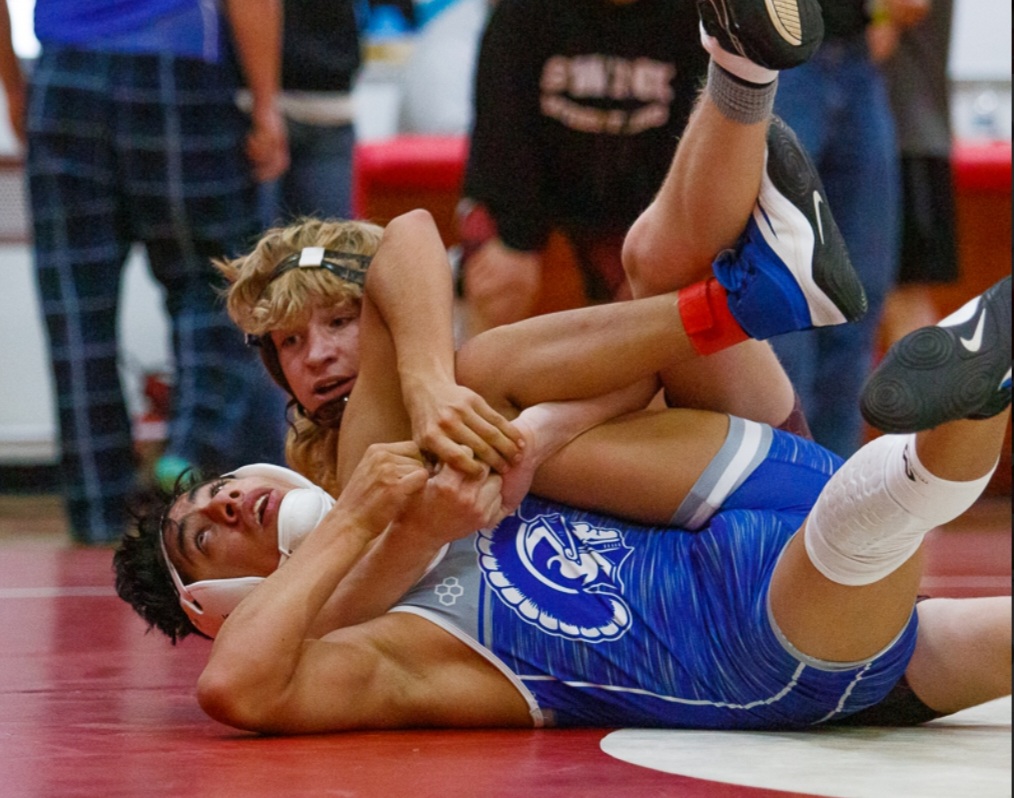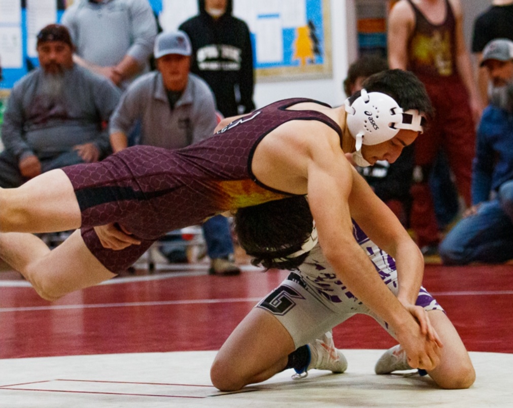 Description: Swink Senior Javen Hall Goes Heels over Head at the Santa Fe League Wrestling Tournament on Jan. 12, 2023. Photos by TC Valdez...