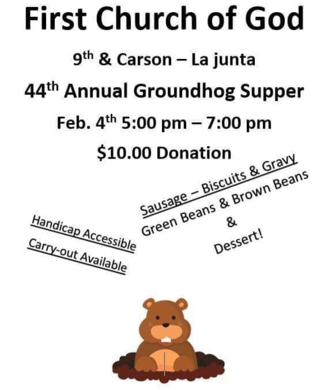 Description: First Church of God - 44th Annual Groundhog Supper on Feb. 4th from 5:00 pm - 7:00 pm... $10.00 Donation - Sausage Biscuits & Gravy Green Beans & Brown Beans & Dessert! Handicap Accessible, Carry-out Available.