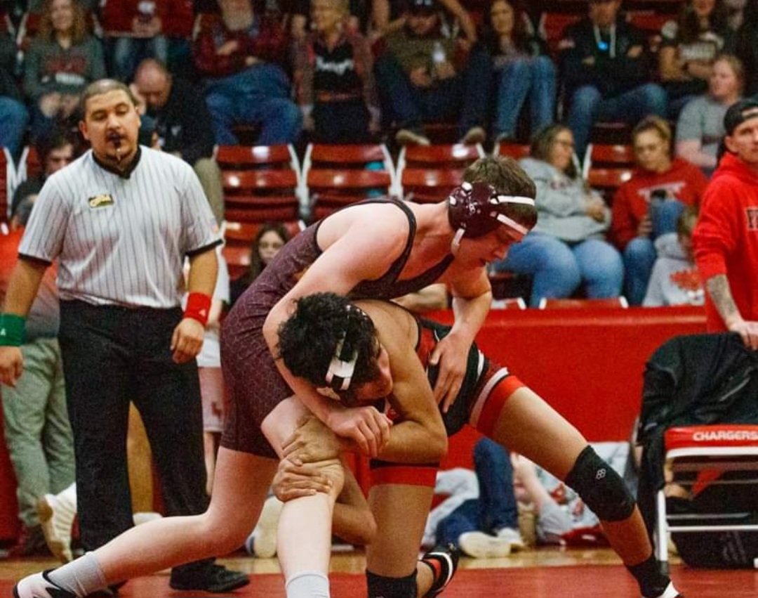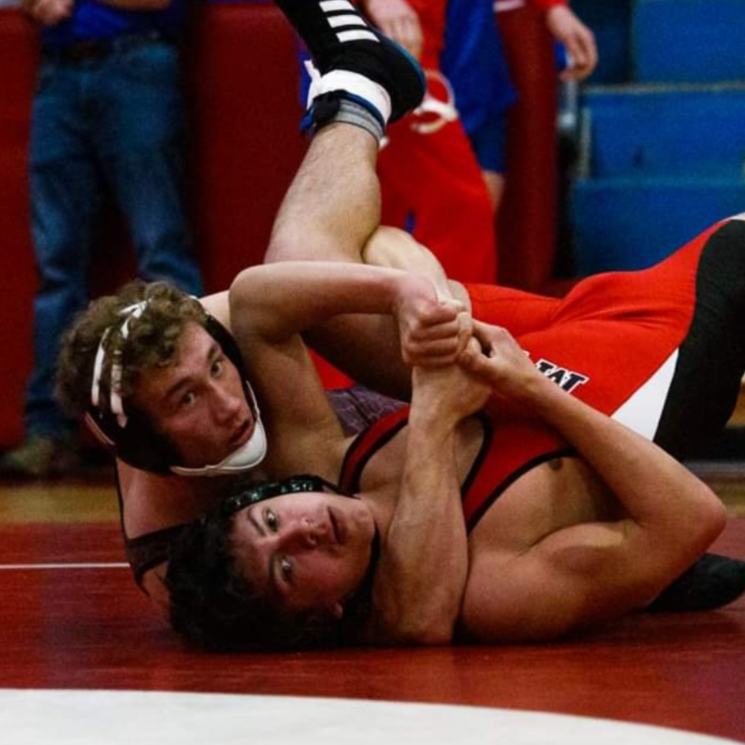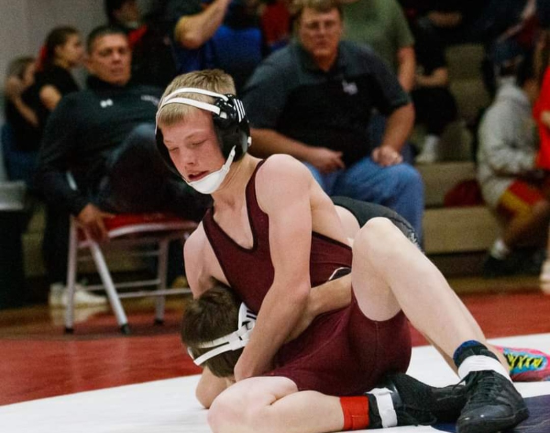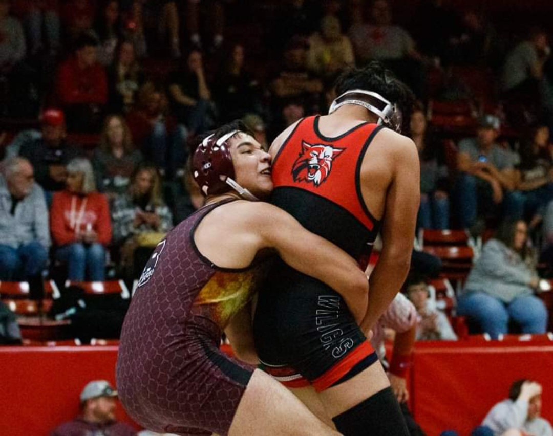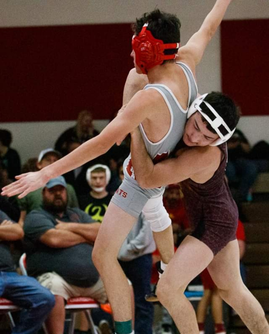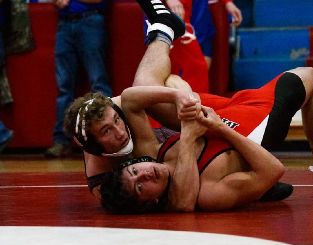 Description: Swink Freshman Judah Hall pivots in pursuit of the winning pin in Crowley County.