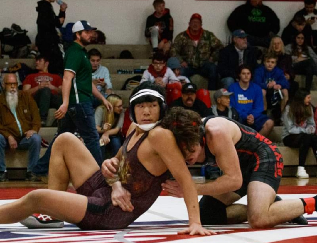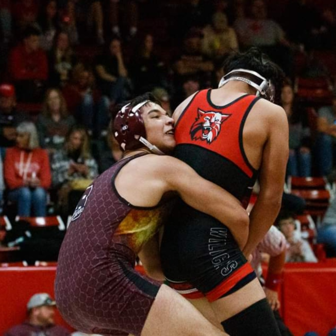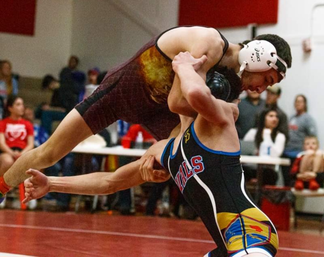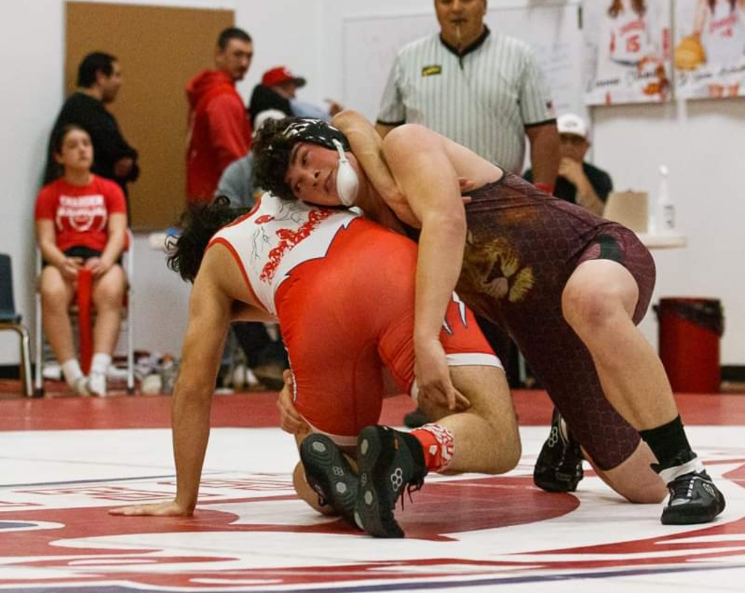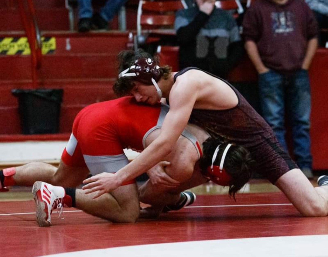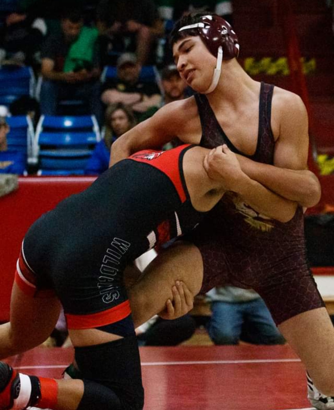 Description: Swink Freshman Judah Hall pivots in pursuit of the winning pin in Crowley County.