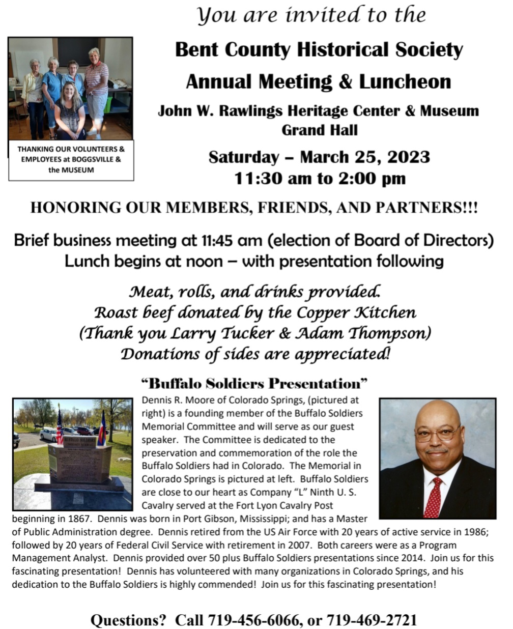 Description: The Bent County Historical Society will be honoring their members, volunteers, employees, friends, and partners. They will have a brief meeting at 11:45 and lunch begins at noon on March 25, 2023.