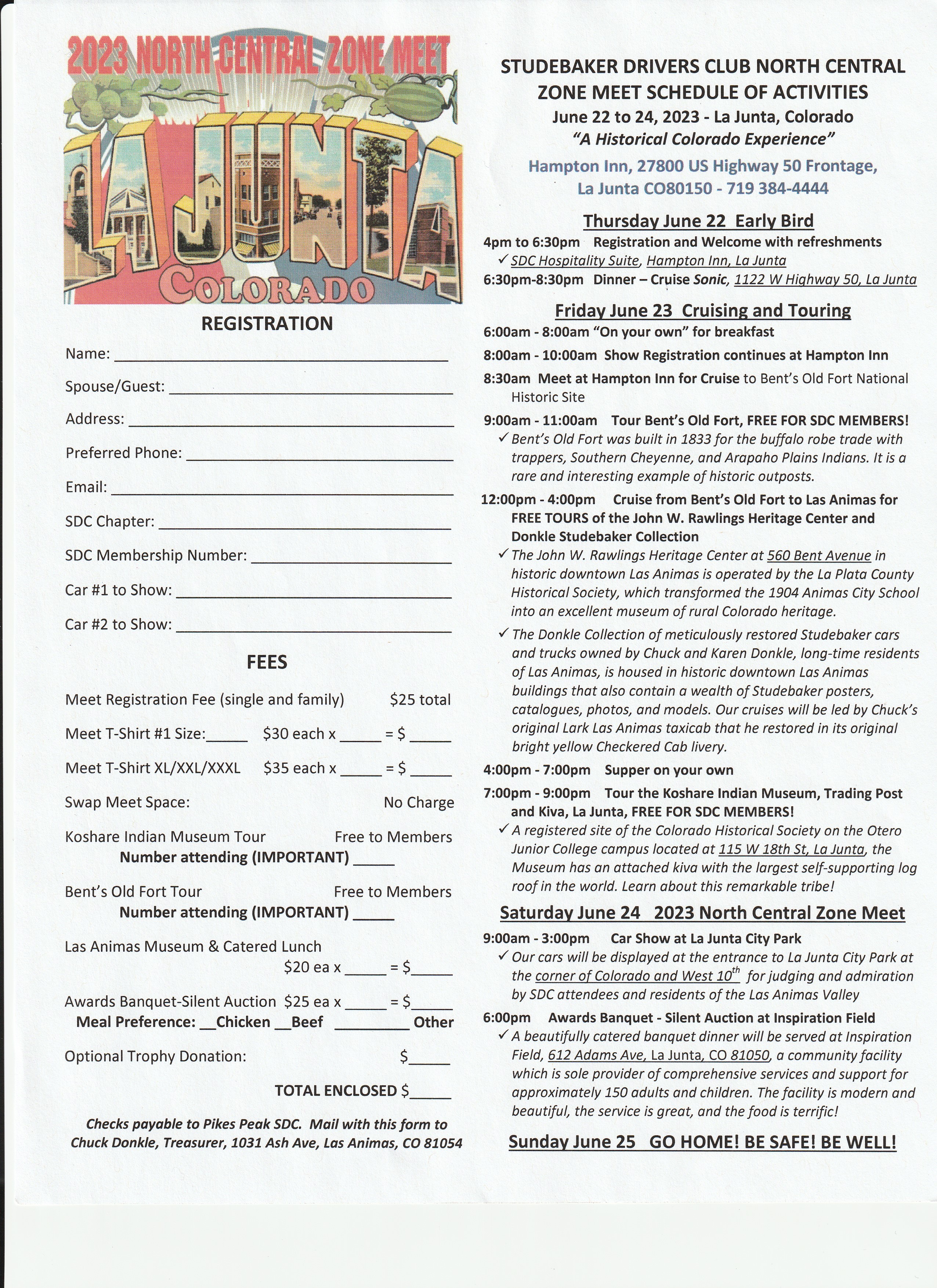 Description: Studebaker Driver’s Club Schedule of Activities for Southeast Colorado Club Activities during the SDC 2023 North Central Zone Meet June 22-24, 2023. Includes Registration Form and Schedule.