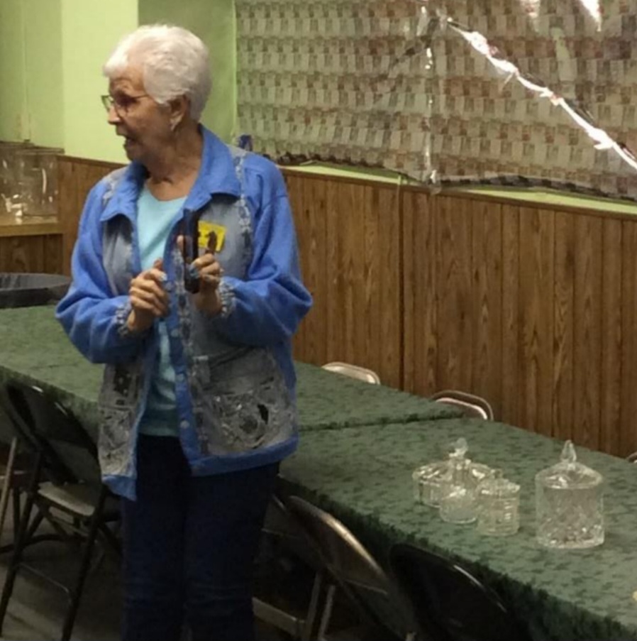 Rethabel Huff showed her crystal glassware and demonstrated a Google device that you can take pictures of something like her glassware and provide the dollar value of the object.