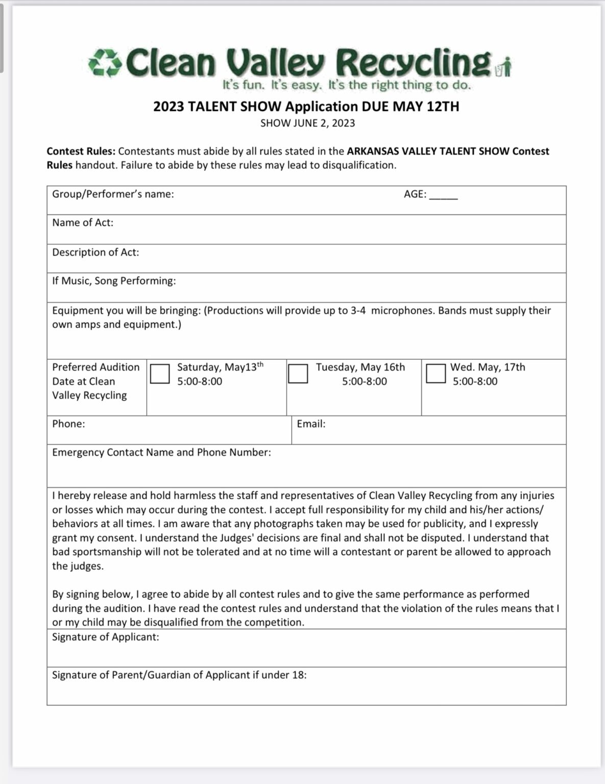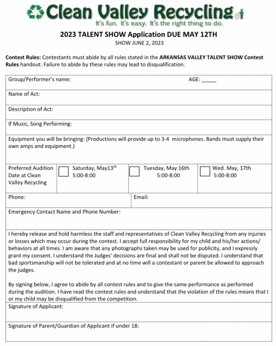 Auditions for 2023 Clean Valley Recycling Talent Show May 13, 16 & 17, 2023