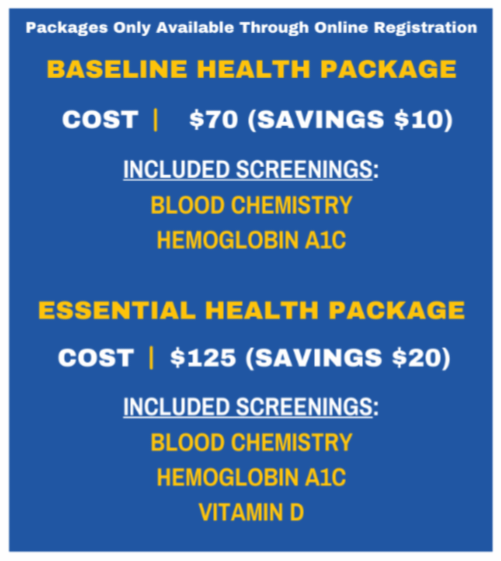 Blood pressure, diabetes risk, mental health assessments, and many more. Screenings vary by Health Fair site.