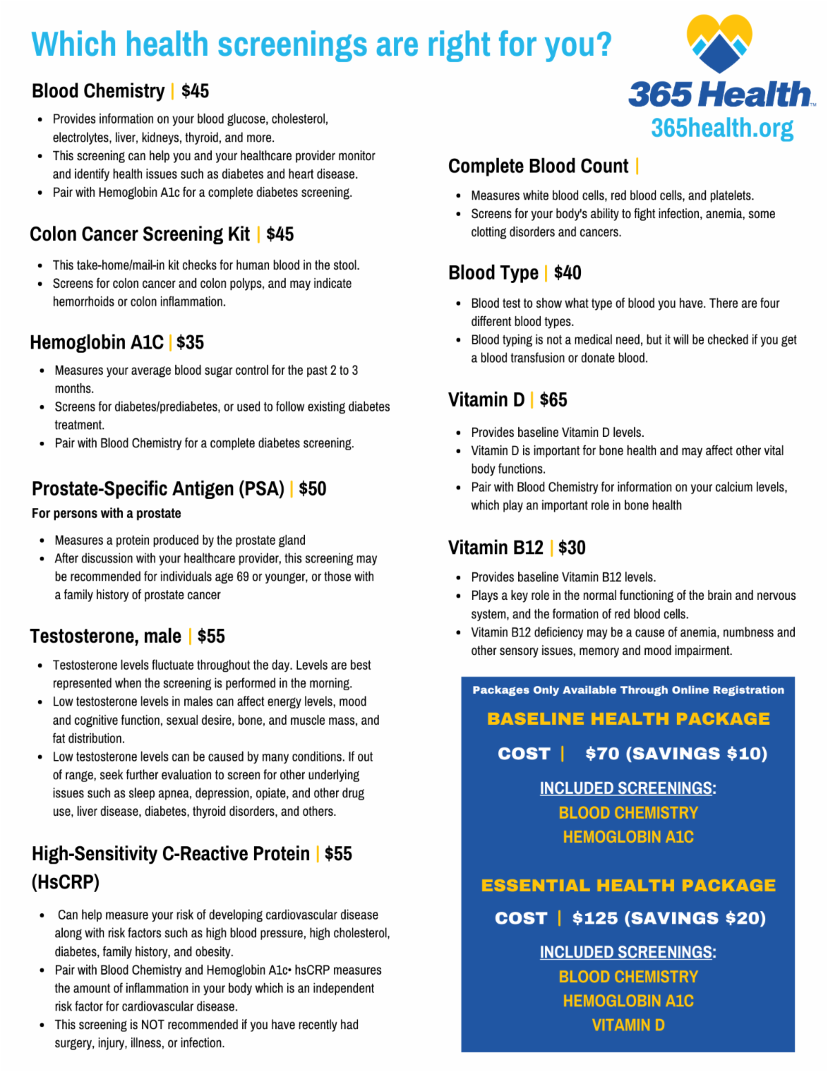 Description: Health Fairs with Free Health Screenings, Affordable Lab Work and one on one time with medical professionals on April 22, 2023 in La Junta. Sponsored by: Quest Diagnostics & 9News - Learn more at 365health.org (View Full Size Flyer with Available Screening Types and Prices in Photo Gallery Below)