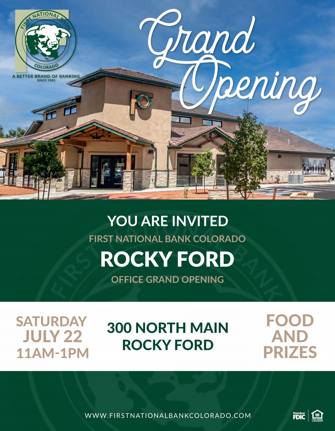 Description: Join The People of Southeast Colorado as we celebrate the Grand Opening of the New First National Bank Colorado location in downtown Rocky Ford this Saturday!