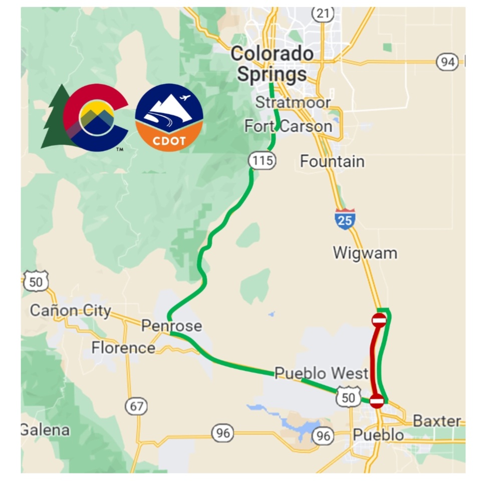 Southbound I-25: Colorado Highway 115 is the quickest and safest route. Drivers will head south on CO 115 until they reach Penrose, then head east on Highway 50 toward Pueblo. CO 115 is currently under construction with a wiidth restriction of 11 feet.