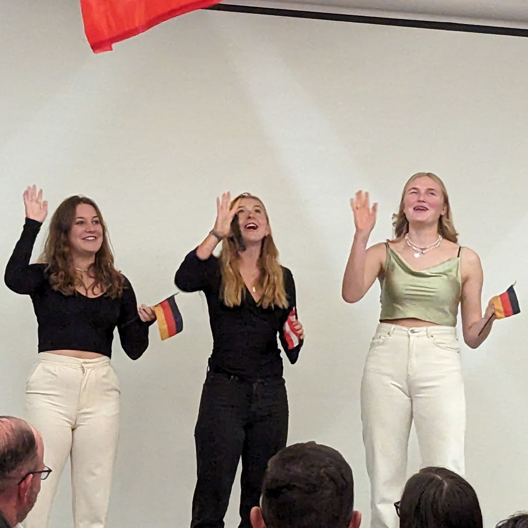 Svetlana Stroitelava, from Russia, read a poem, "A Letter to a Woman," by Sergey Esenin, first in Russian and then in English. Celia Keck, Julia Kottbauer and Hedda Koehne from Germany sang and danced a funny German song.