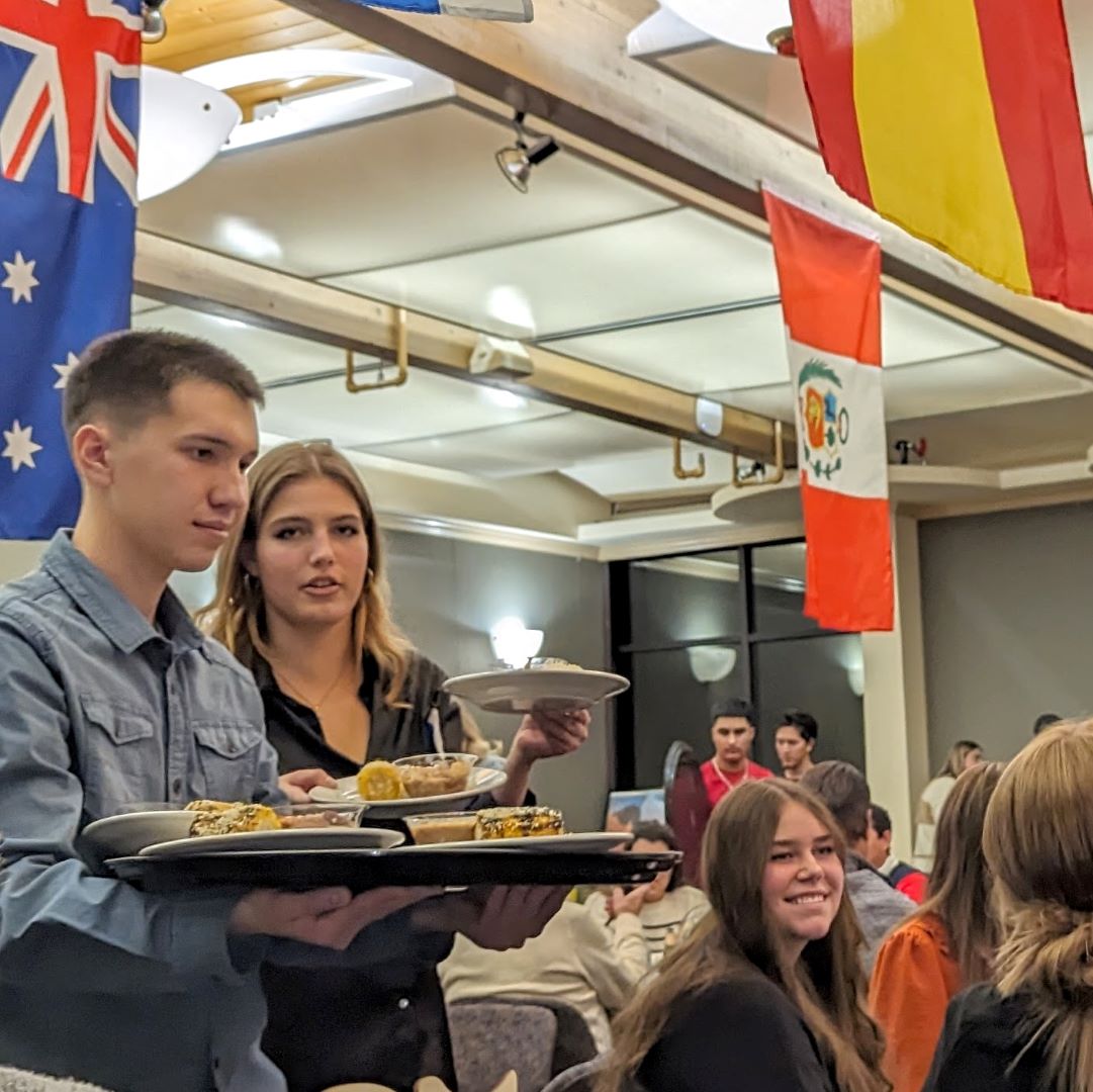 The delicious meal, prepared by Victor Agena of Sodexo Food Services and his staff, was served by the students. The menu included Appetizers: Bruschetta (Italy), Chicken Teriyaki Potstickers (Japan), and Beef Empanadas (Spain); Entrees: Istiran Jota (Croatia), Elotes (Mexico), and Sinangag (Philippines); and Desserts: Brownie de Chocolate (Peru); Sharbat (Ancient Persia) and Baklava (Greece).