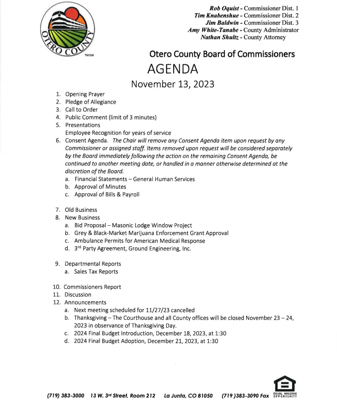 In announcements, the commissioners canceled the meeting scheduled for November 27, 2023. The Otero County Courthouse and all county offices will be closed November 23 through 24 in observance of Thanksgiving Day. Also the 2024 final budget introduction is scheduled for December 18, 2023 at 1:30PM and the 2024 Final Budget Adoption is scheduled for December 21, 2023 at 1:30PM.