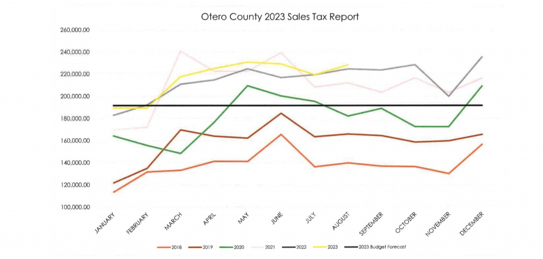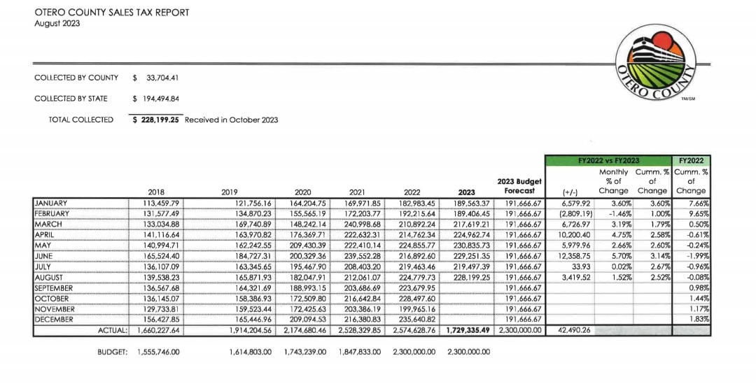 Otero County Administrator Amy White-Tanabe gave the county sales tax report, which was $3,419 more than August of 2022, which is a 1.52% increase over the previous year.