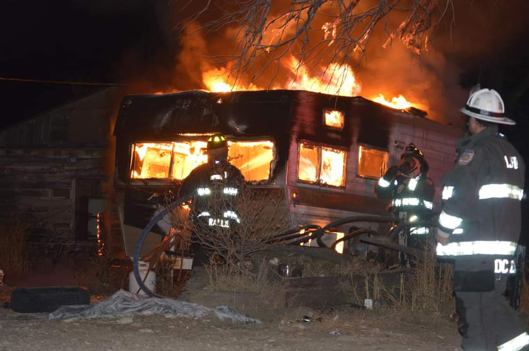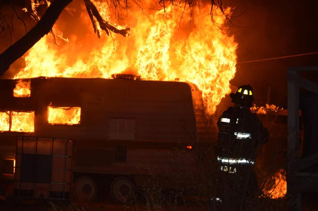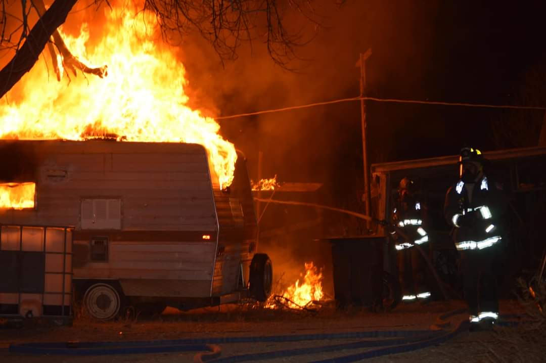 At approx 6pm this evening, we responded to a reported camper on fire possibly threatening other structures. Upon arrival of Deputy Chief and Eng 1, a camper was fully engulfed and confirmed nobody inside of it.