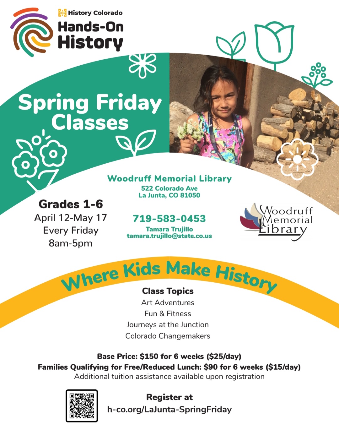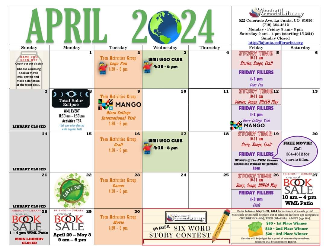 Description: Woodruff Memorial Library in La Junta Offers Lots to do this month. Check out their activity calendar for April, 2024.