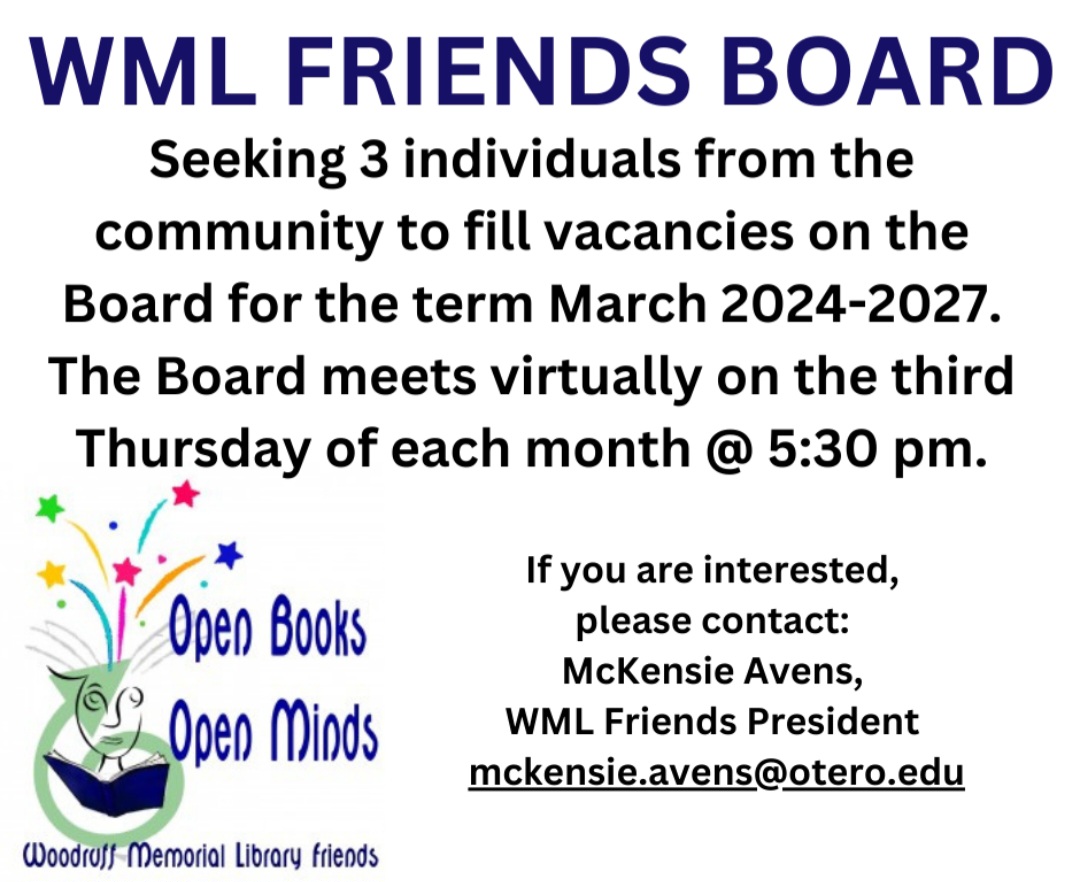 The Friends of the Library Board still has three vacancies that need to be filled (see attachment).