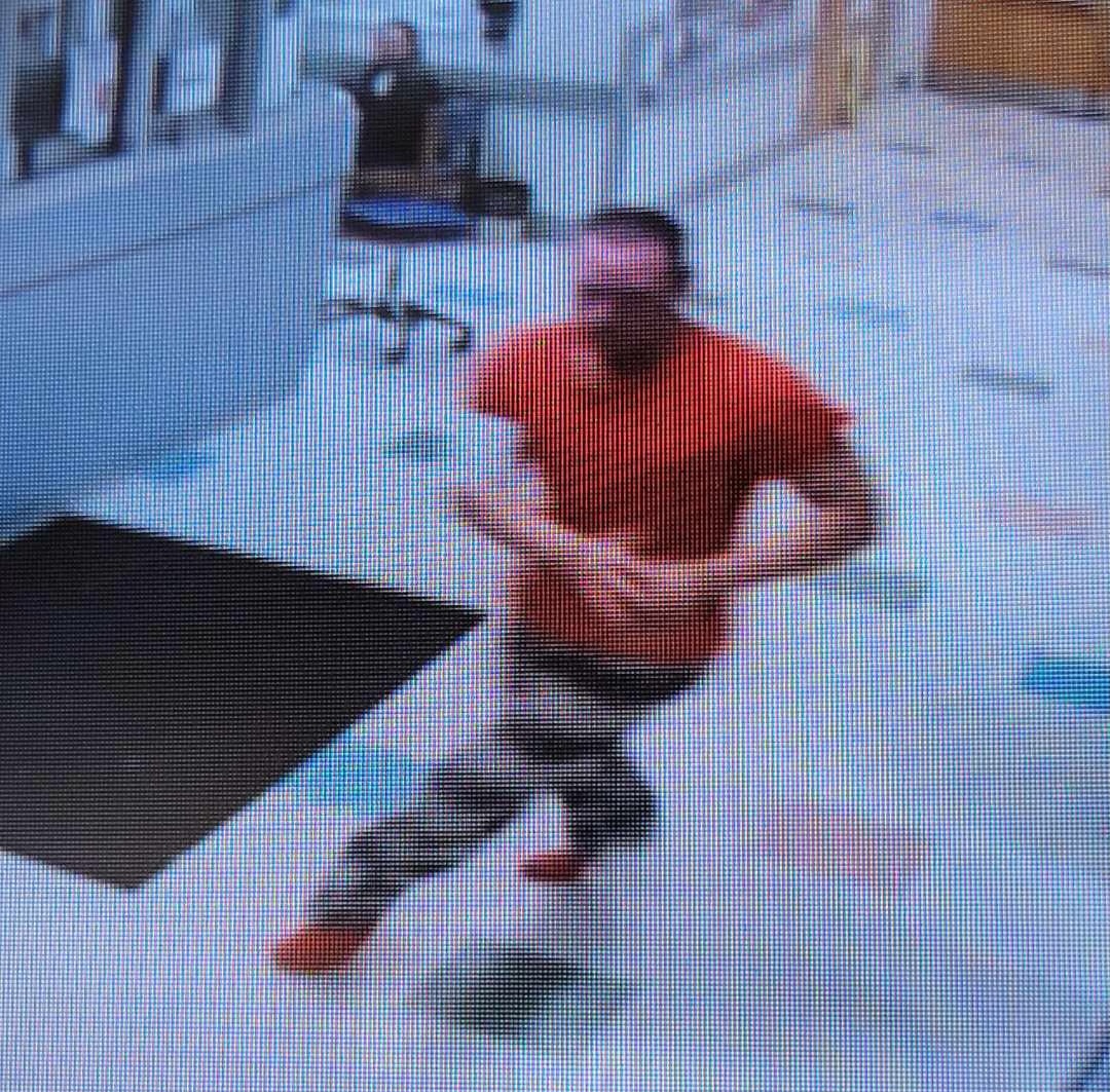 He is a 38 year old white male described as 6 ft tall, 180 pounds, brown hair and green eyes wearing an orange shirt, black and white striped pants, and orange socks with hands cuffed in the front.