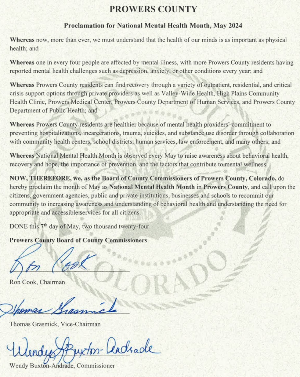 NOW, THEREFORE, we, as the Board of County Commissioners of Prowers County, Colorado, do hereby proclaim the month of May as National Mental Health Month in Prowers County, and call upon the citizens, government agencies, public and private institutions, businesses and schools to recommit our community to increasing awareness and understanding of behavioral health and understanding the need for appropriate and accessible services for all citizens.