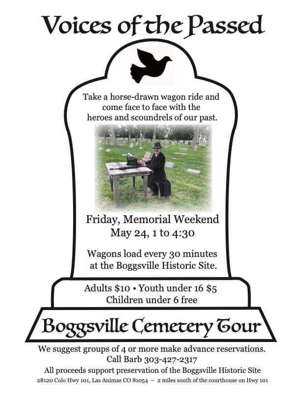 The Voices of the Passed Cemetery Tour returns to Boggsville Friday, May 24th, from 1 to 4:30 p.m. Come join us and take a horse drawn wagon ride to come face to face with the heroes and scoundrels of our past.