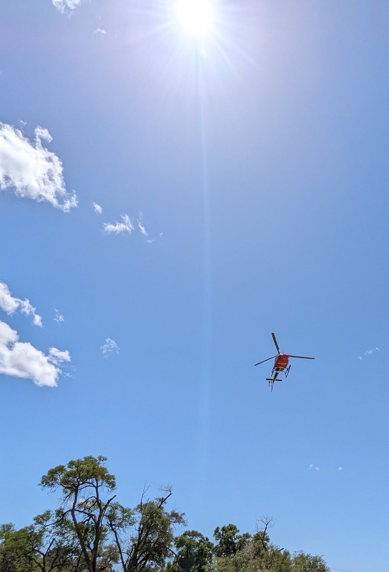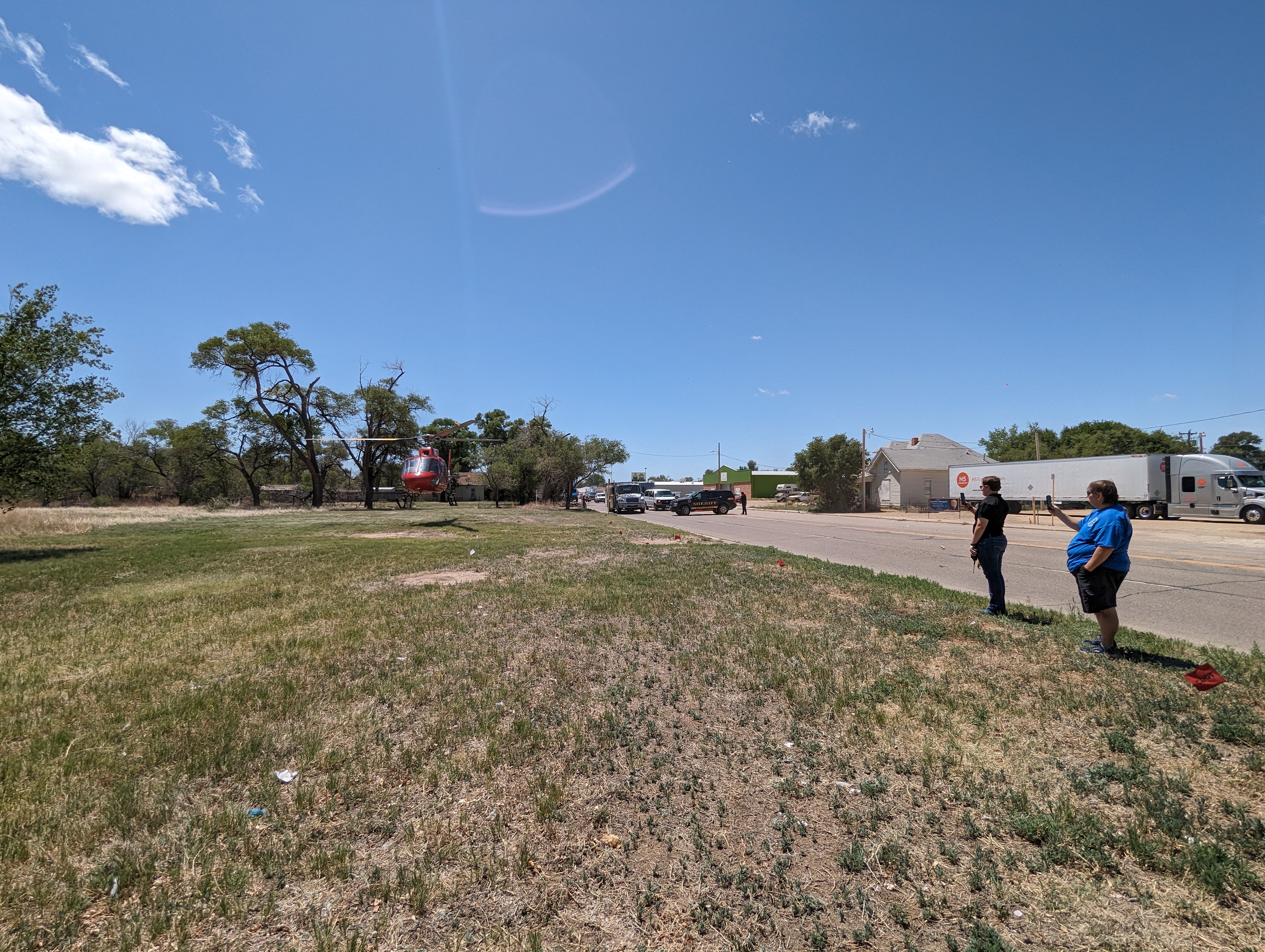 EMTS Lexie Devie and Makayla Hall await the landing near the ambulance barn as Bent County SO deputies hold back traffic on Highway 50.