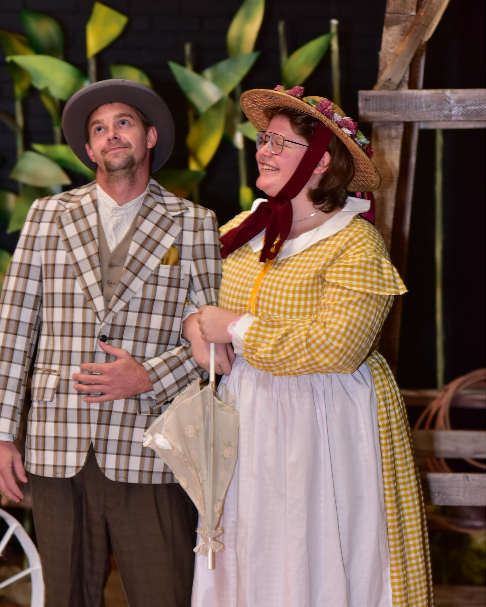 The dancing in this musical is incredible. Thanks to choreographers Rena Ruiz and Desiree Goheen. Their featured dancers are Maddie Jones, Fatimah Mirakhor and Rena Ruiz. They are joined by many from the ensemble who are a delight to watch as they move across the stage. I’d like to say a word for the farmers and cowboys. Their singing, dancing, and comedic antics bring great fun throughout the play. It is also fun to see some veteran character actors and ensemble players return for this production: Tim Baublits, Dawn Pollmiller, Judy Hensley and Julie Meiklejohn.