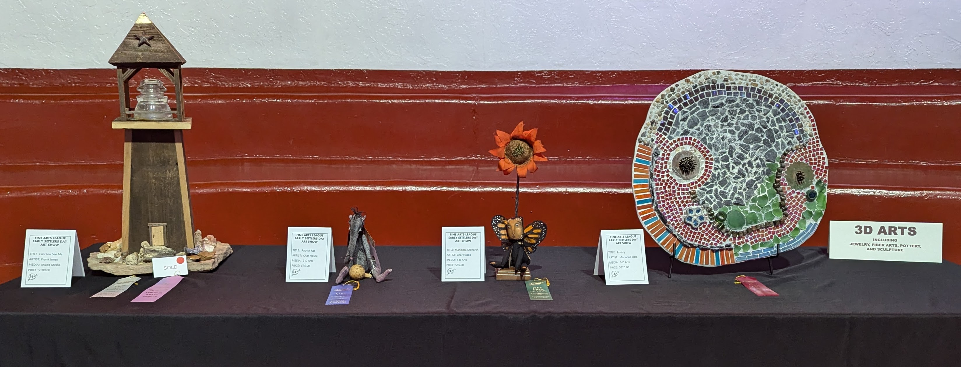 3D Arts: First, Char Hosea, “Ratrick Rat;” second, Marianne Hale, “Frenzy;” third, Frank Jones, “Can You See Me?;” honorable mention, Char Hosea, “Mariposa Monarch.”