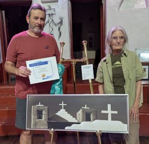 Al Trujillo, left, won the Jurors Choice Award for his photo, Faithful at San Geronimo. At right is judge Lani Vlaanderen.