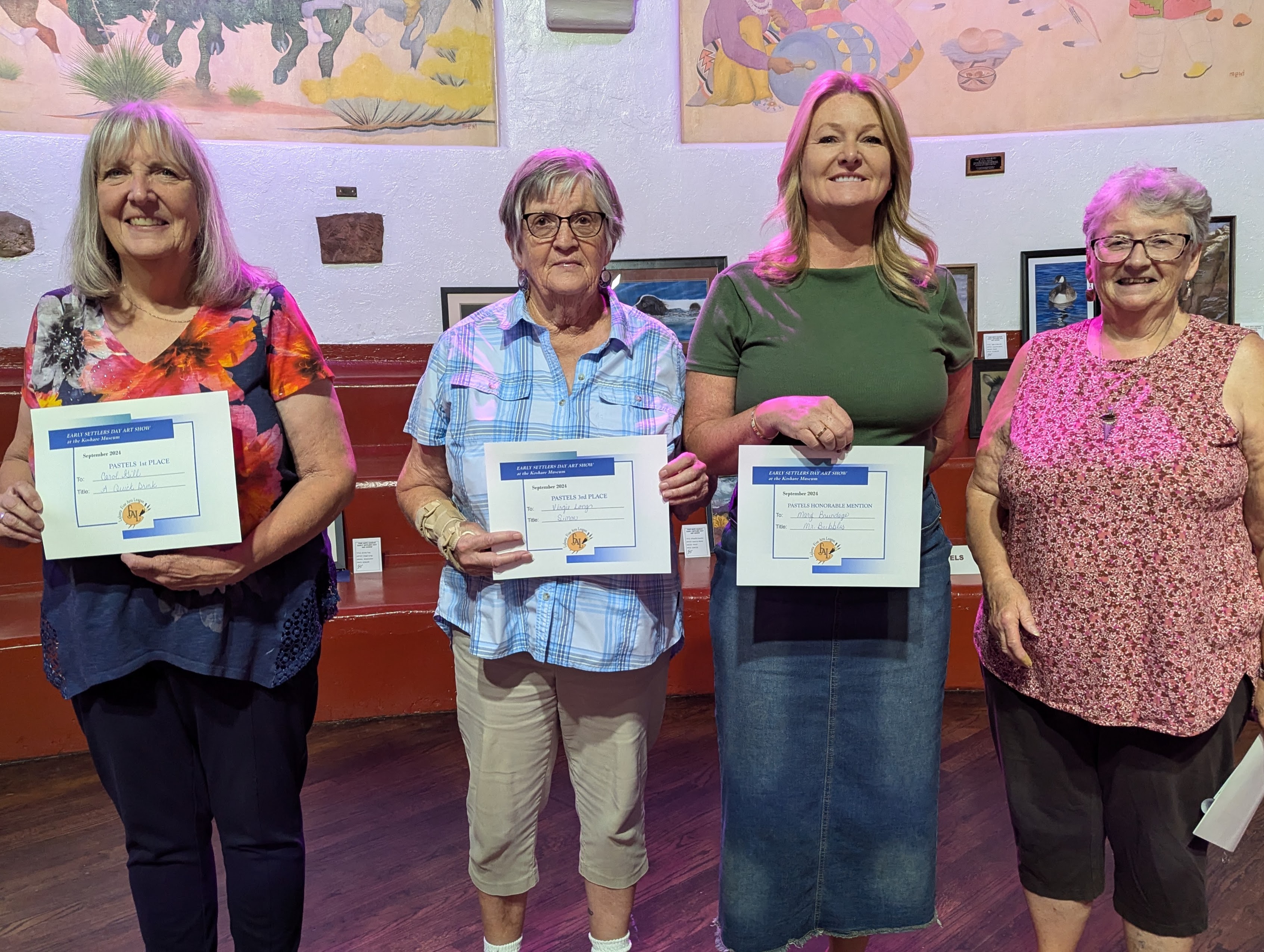 Pastels: First, Carol Gill, “A Quick Drink;” second, Laverne Hanes, “C’s Tree;” third, Virgie Long, “Simon;” honorable mention: Laverne Hanes, “Cacti;” and Mary Brundage, “Mr. Bubbles.”