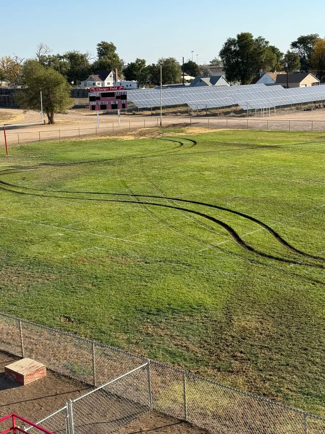 We are asking for the community's help in identifying the individual responsible for damaging the Crowley County High School football field. Between 3:30 AM and 4:00 AM on Monday morning, October 14, 2024, someone drove a pickup truck onto the field and did donuts, resulting in significant destruction to the turf. This damage may impact the upcoming home game against Fowler on November 1st.