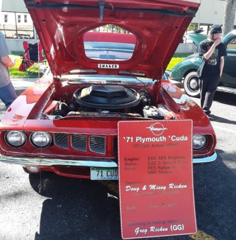 There were 4 members with their cars in the Tarantula Days parade. Eight members participated in the car show plus two others. Chuck Donkle won the 50/50 pot. There $43 in sales of dash plaques. Also $85 was made at the car show in the park.