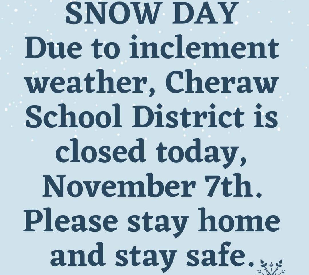 Due to inclement weather conditions, CCSD will be CLOSED today Thursday, November 7th, 2024. All afternoon practices are canceled as well as the Junior High Boys Basketball game.