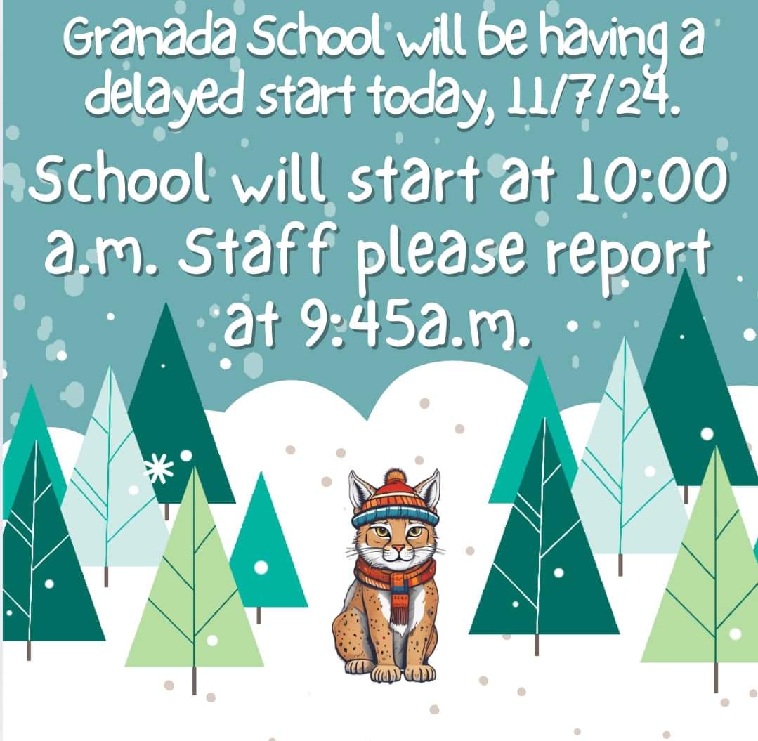 Due to inclement weather, Granada School will be on a delayed start today, 11/7/24. School will start at 10 AM. Staff please report at 9:45 AM. There will be no breakfast served.