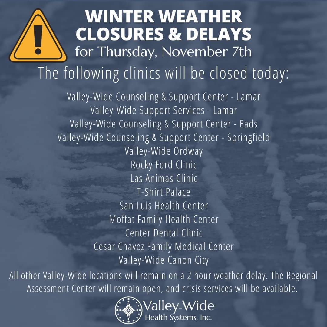 Valley-Wide Health Systems is Closed Due to Winter Weather Conditions. This does not affect The Regional Assessment Center (The RAC) which will remain open.