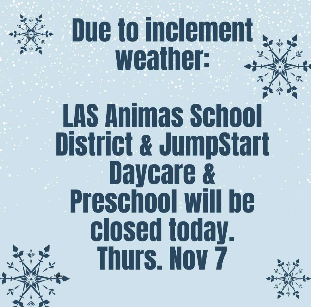 Due to inclement weather, Las Animas School District & JumpStart Daycare & Preschool will be cancelled on Thursday, Nov. 7. All after school games/activities are cancelled.