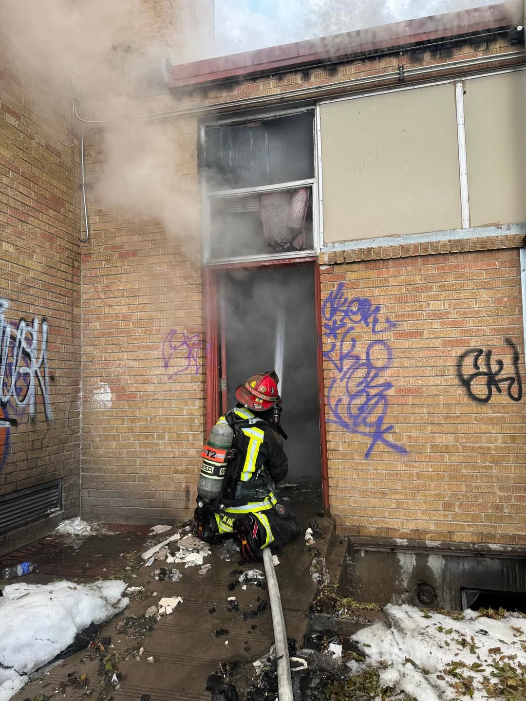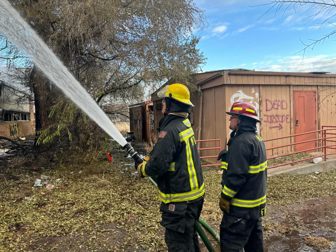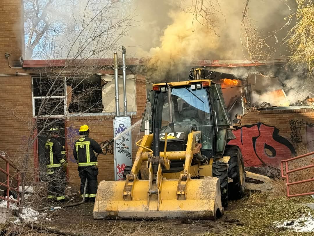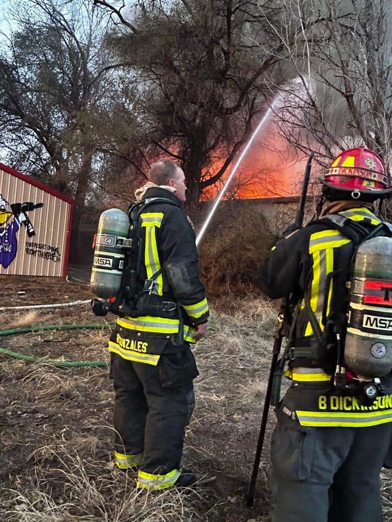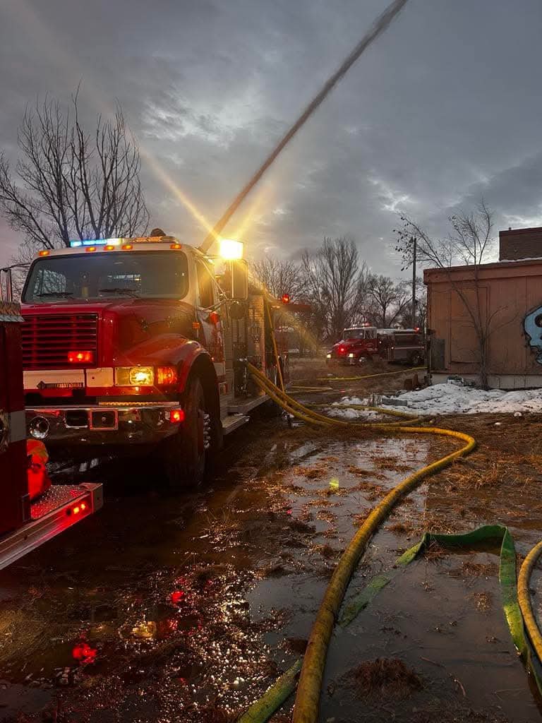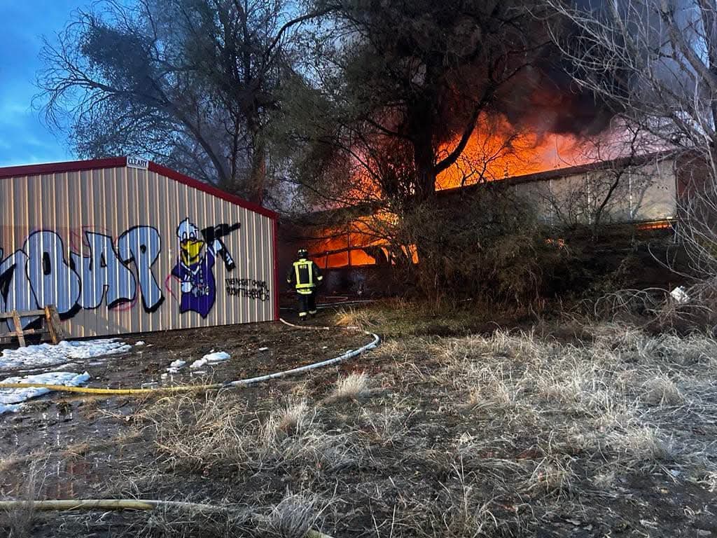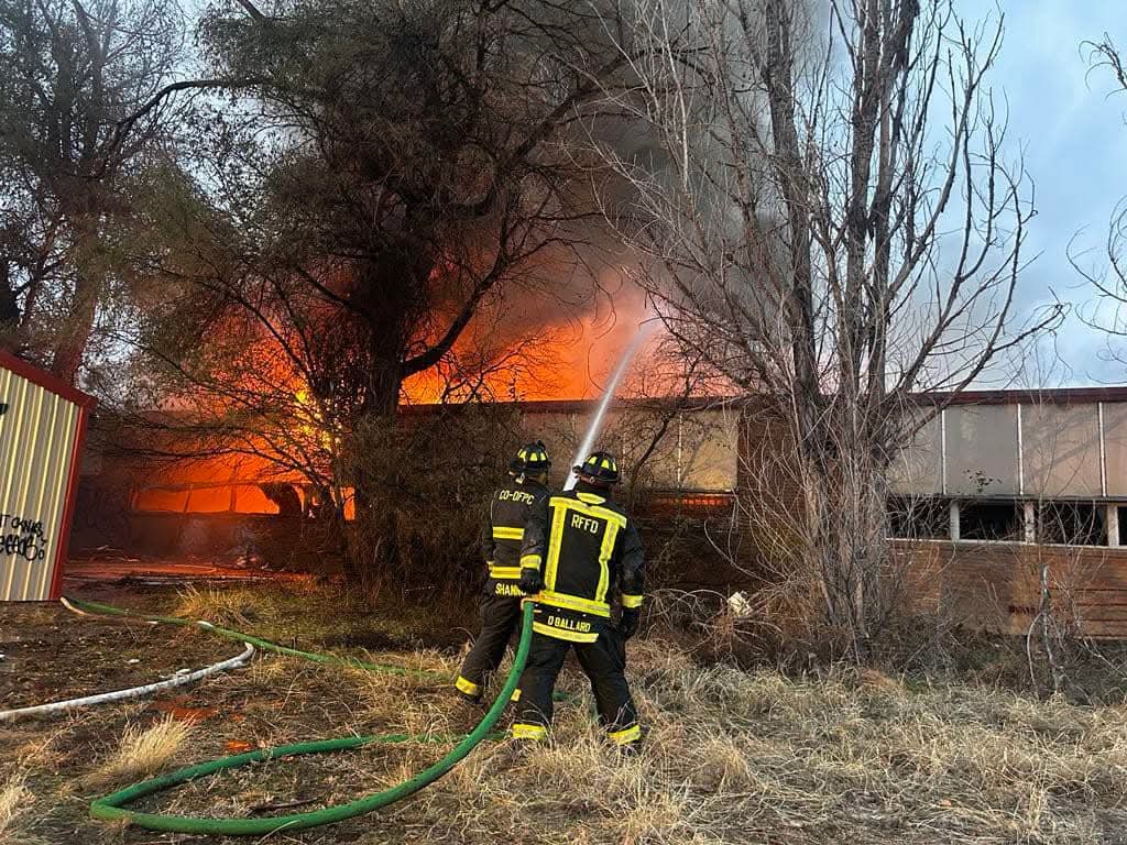 Colorado Departments of Fire Prevention and Control utilized their cadaver dog to ensure no persons in building. This is due to this site known for being a site for vagrants, and illegal drug activity. No injuries or casualties from this fire. Owners were notified.