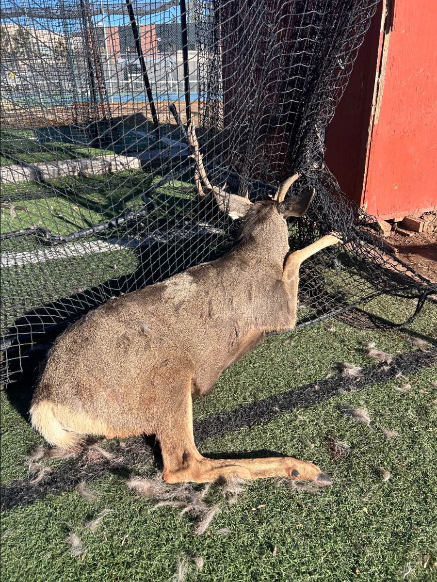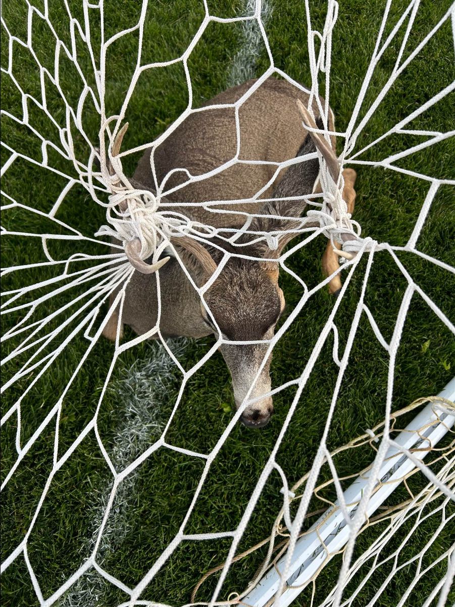 Pictured in the Gallery Below: Mule deer bucks have recently been tangled in soccer goals and batting cage netting in Durango. Both bucks pictured were tranquilized so wildlife officers could cut away the netting and set the deer free.