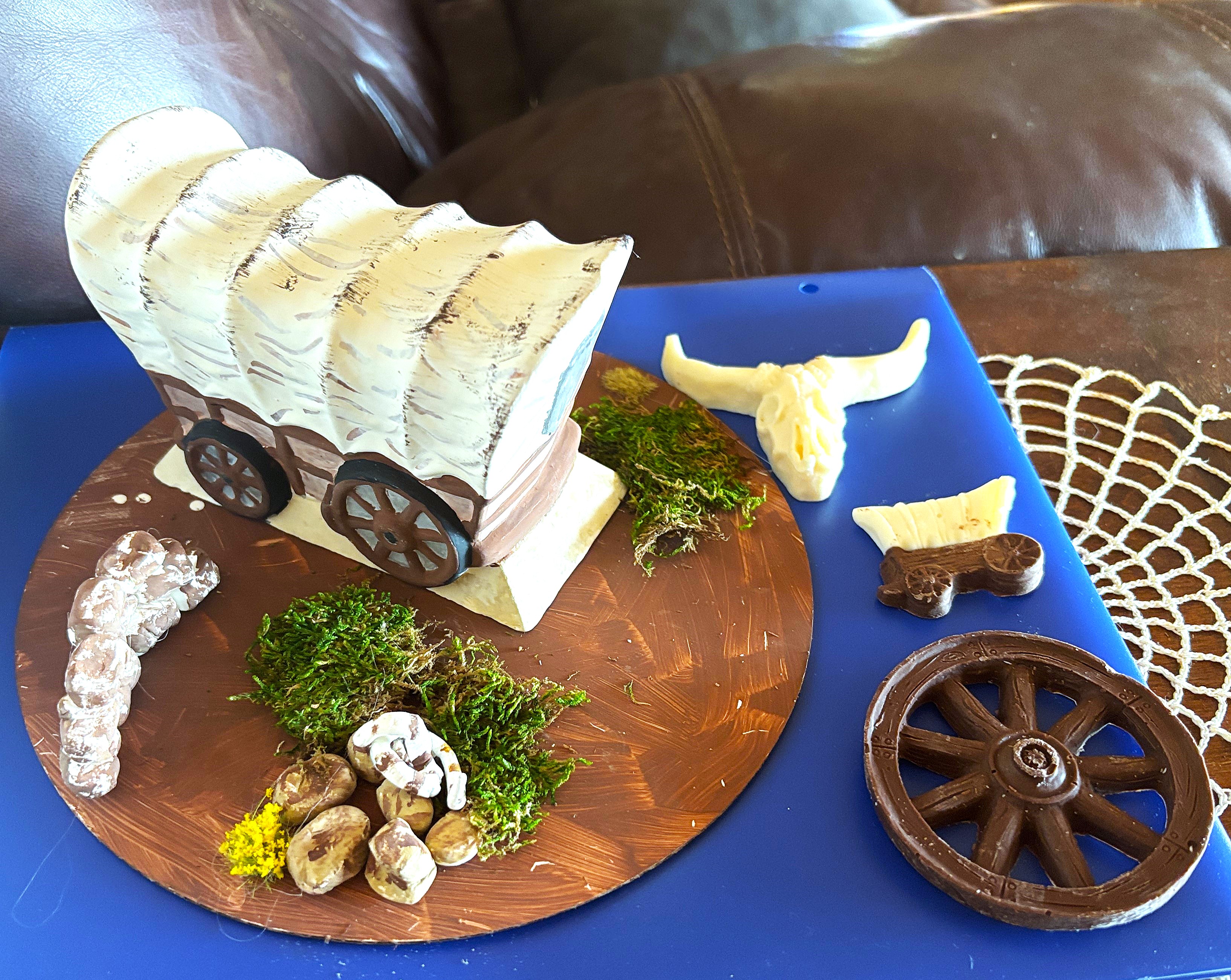Steve Bourne provided us with a very delicious roast beef and roasted potatoes, and green beans for our meal. We decided because of this being a 30th Anniversary celebration, the meal would be free for members. Linda Bourne provided a cake and made a wagon scene table center decorations and trail related candies for each table. I made placemats for each place at the tables with stories I found from old newspapers articles related to the SFT. We also had a 50–50 drawing, and a silent auction of SFT items for sale.