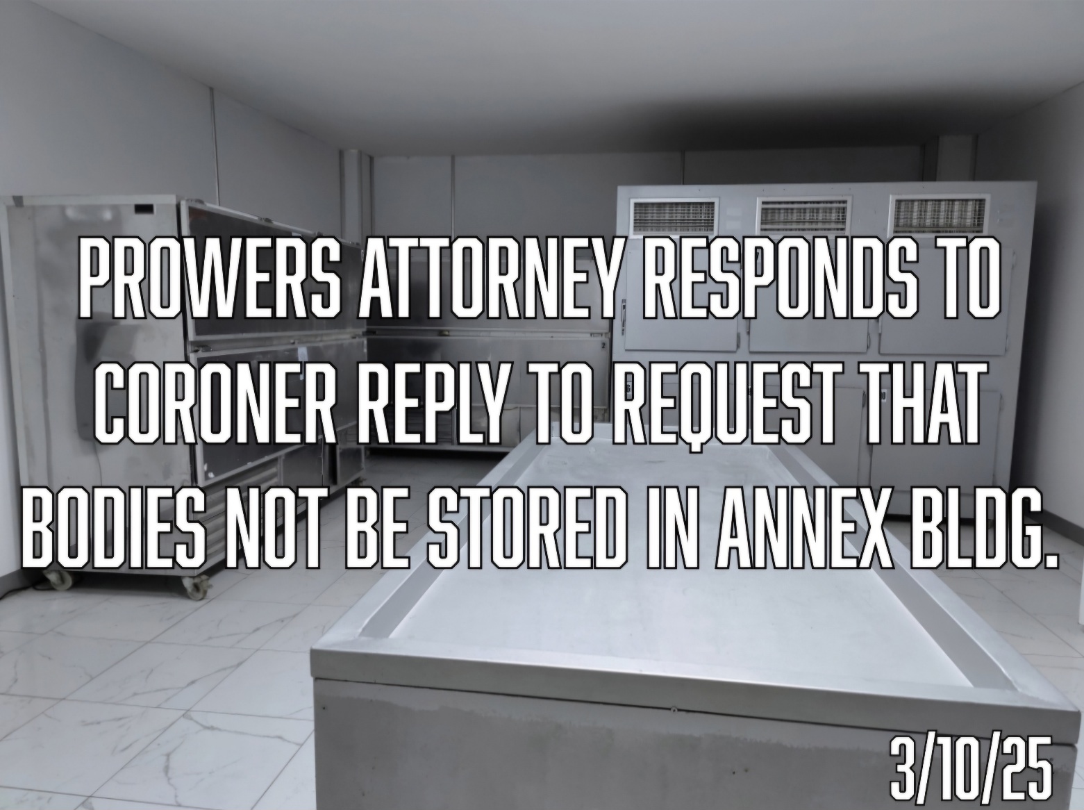 Prowers Attorney Responds to Coroner Reply to Request that Bodies Not Be Stored in Annex Bldg.