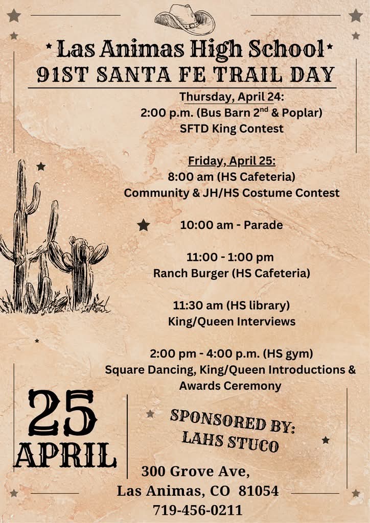 Description: Join the People of Southeast Colorado for the 91st Annual Santa Fe Trail Day Celebration in Downtown Las Animas on April 25, 2025... The Bag Lady Boutique, @ The Car Wash, D&M Auto & Truck Repair, Promenade and Floral Designs, and On The Spot Sales and Service - Vacuum Sales and Service on all models...