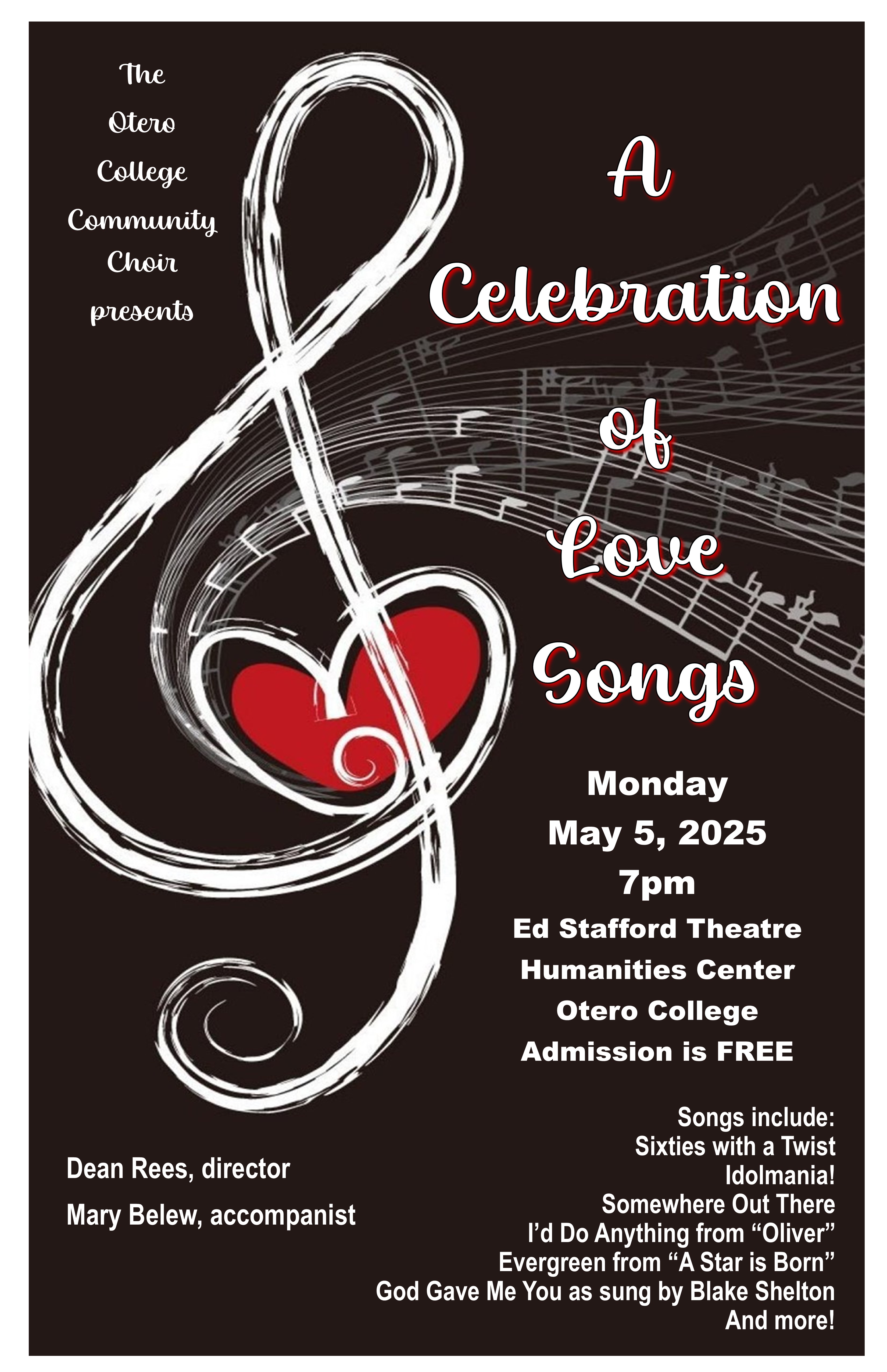 The Otero College Community Choir is proud to present “A Celebration of Love Songs”. The concert of love songs old and new will be performed on Monday, May 5, at Otero College’s Humanities Center. 7:00 pm. Admission is free.