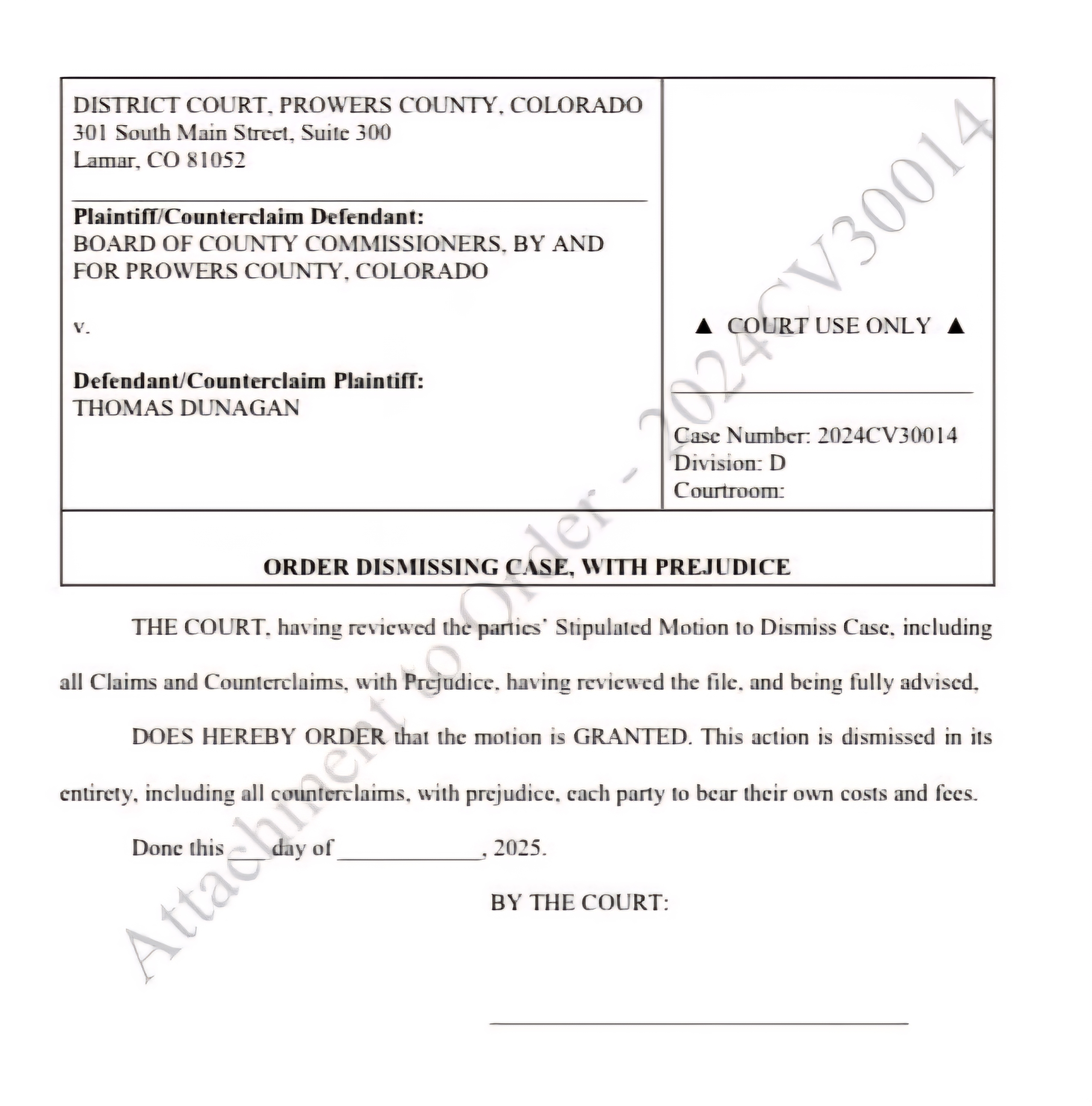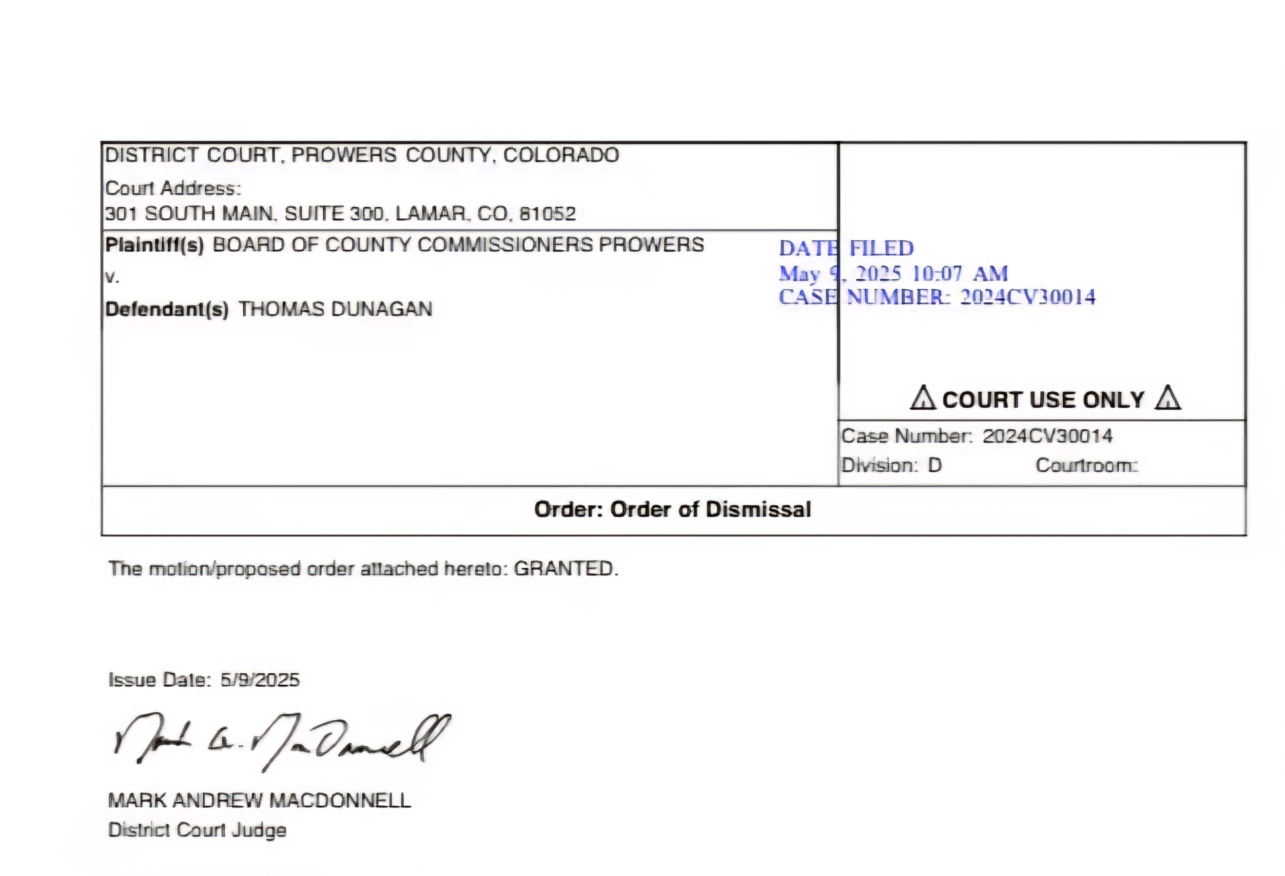 Description: Lawsuit Against Prowers County Coroner Dismissed With Prejudice; Coroner Offers Public Transparency and Seeks Cooperation Moving Forward... Prowers County Coroner Thomas Dunagan Released the Following Statement and Court Documents on June 6, 2025...