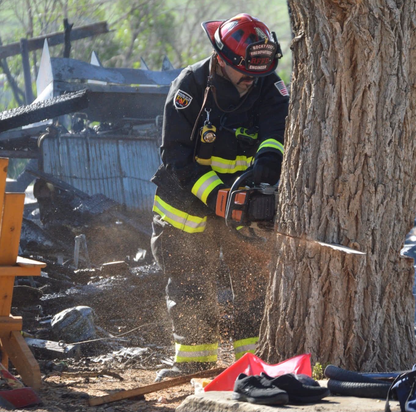 Crews continued to extinguish the fire and ended up cutting two trees down that were on fire at the top of them to help extinguish.