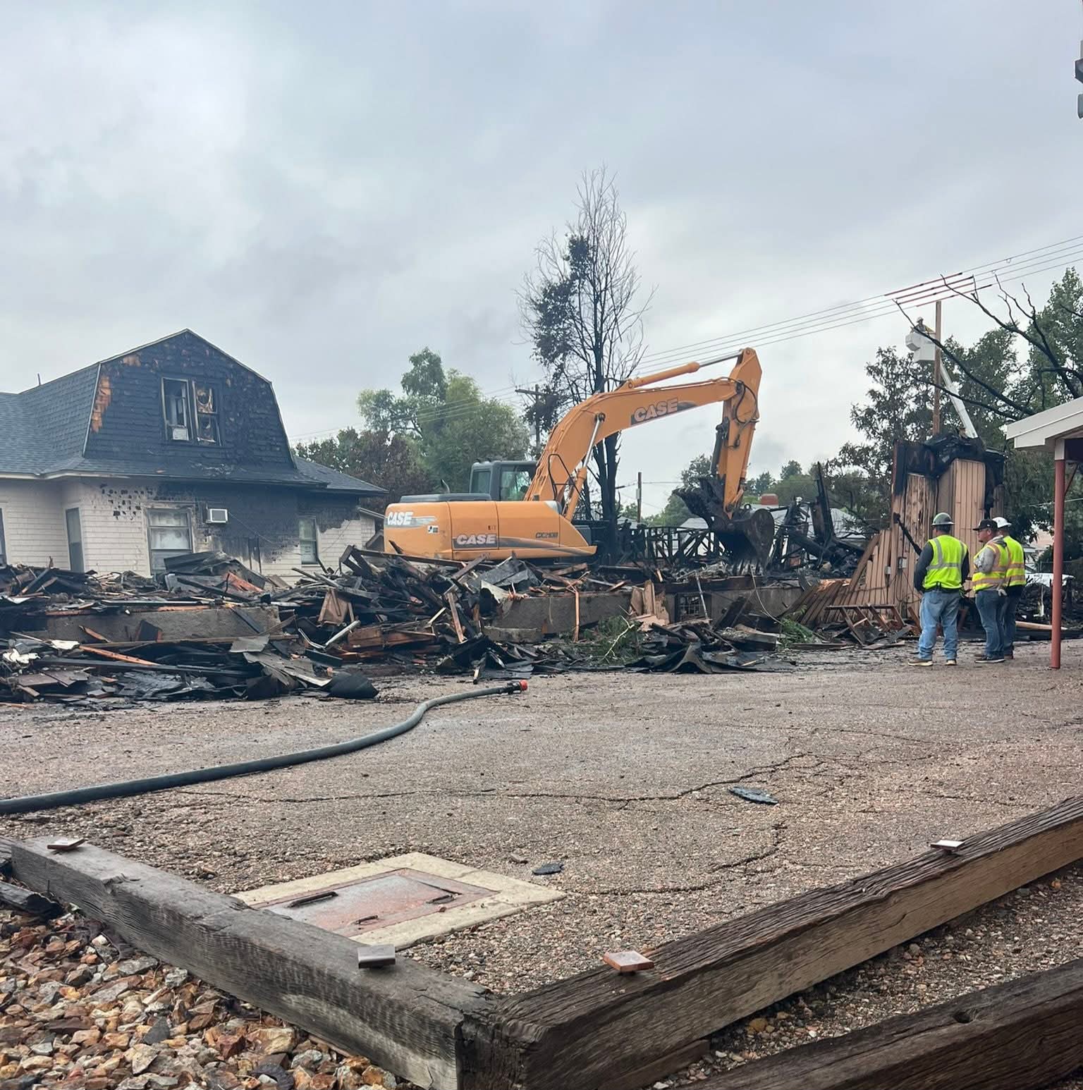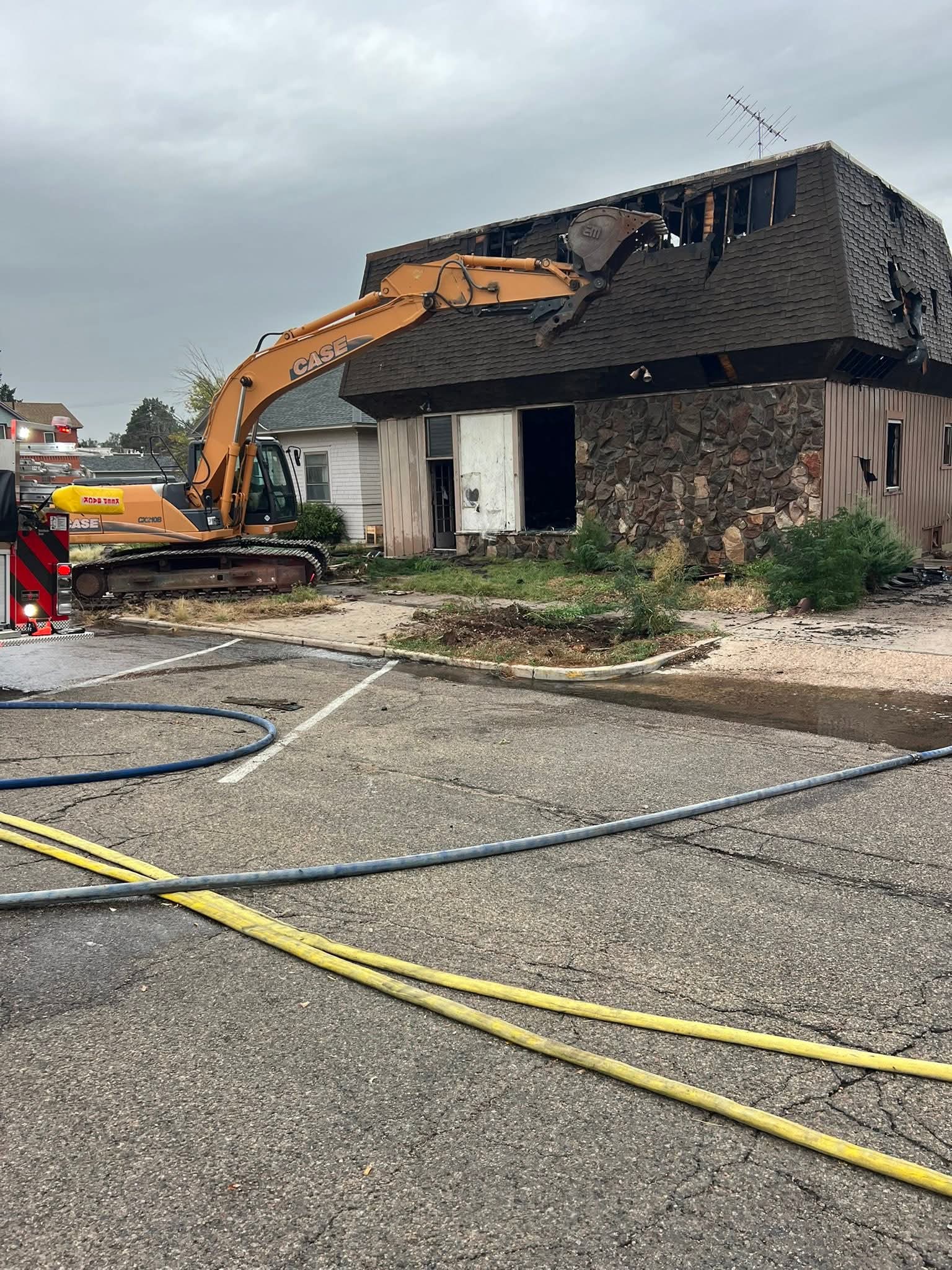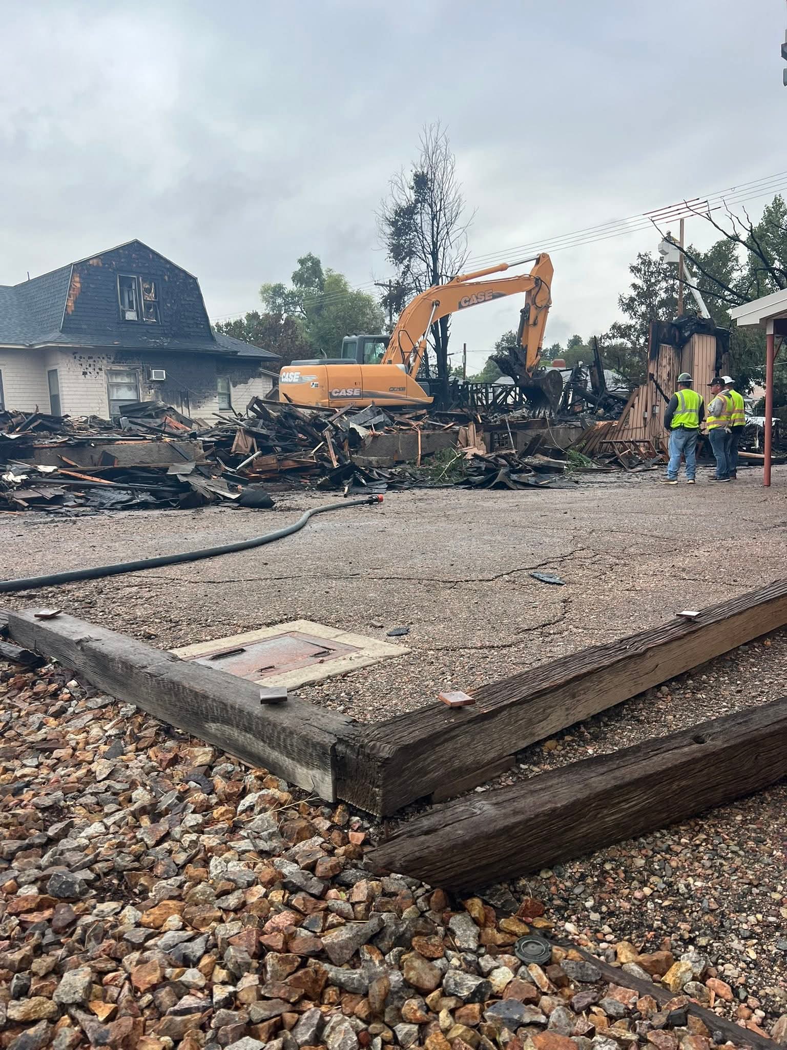 At day break, a excavator and crews from the City of La Junta Streets Dept was called into secure to help tear apart of the building so we could make sure the fire and hot spots were fully extinguished and the building would have been a unsafe risk for the community.