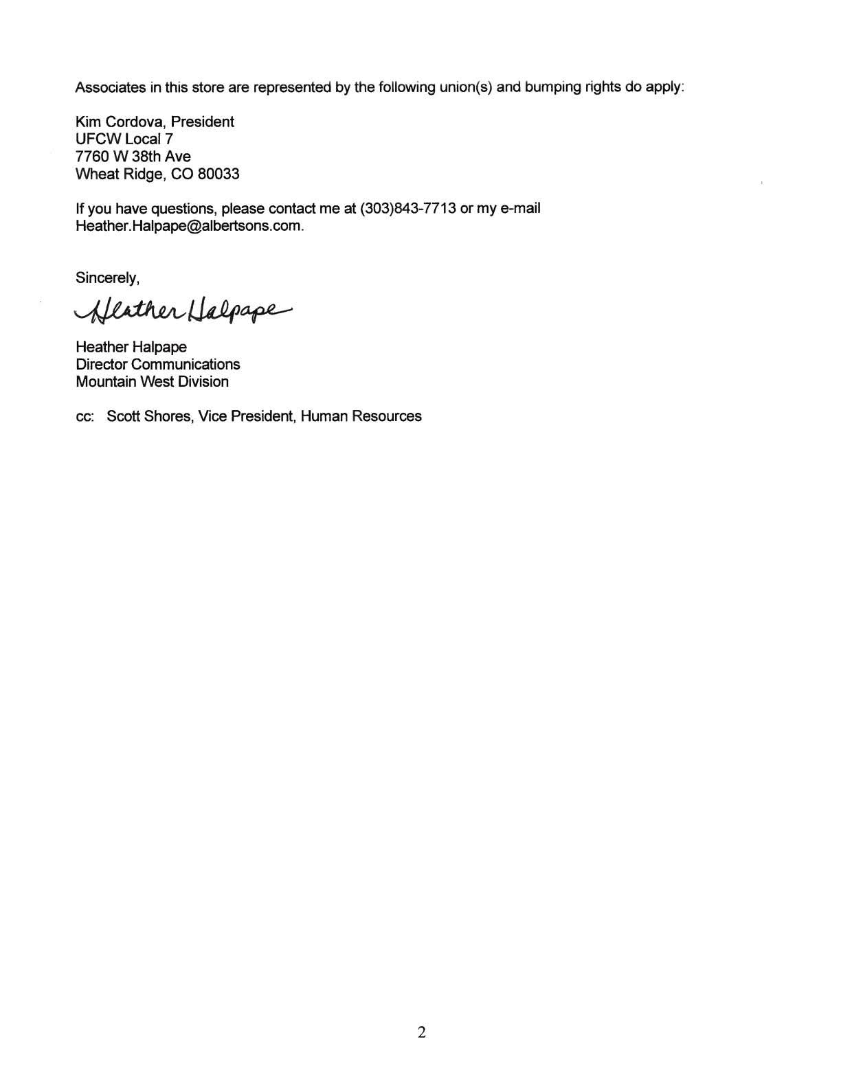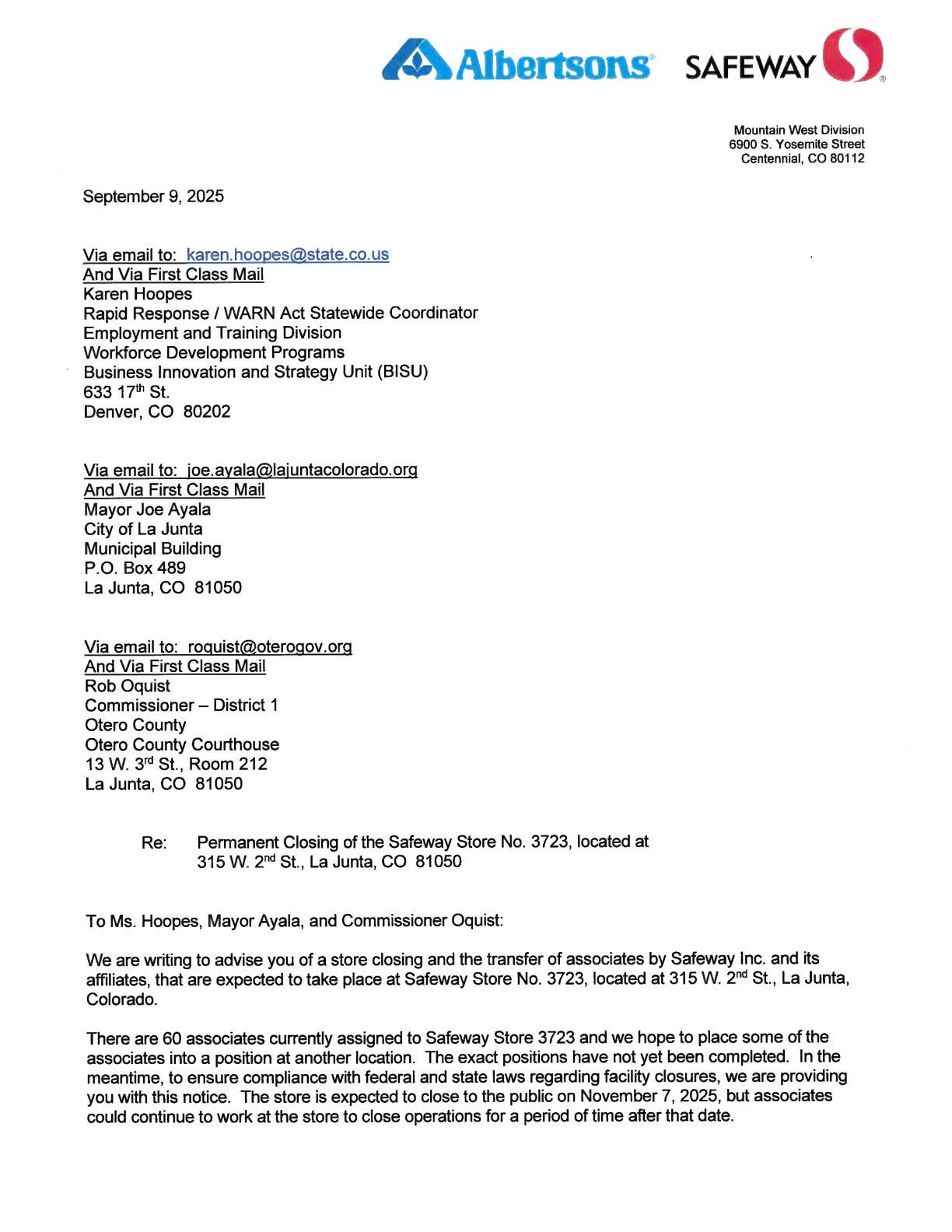 Official letter from Albertons / Safeway Attached Below. I have been on the phone with Economic Development as well as La Junta Chamber of Commerce. More information to come.